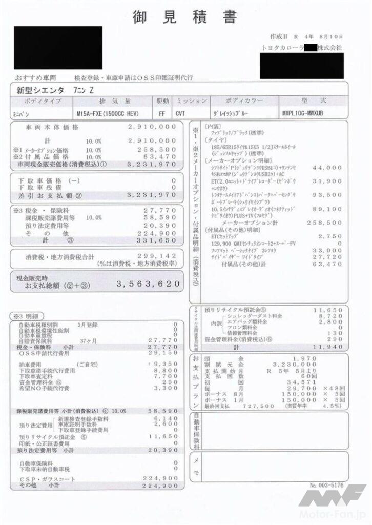 さて、問題はお値段。ユーザーさんは予算350万円程度を想定しており、「これは大幅にオーバーするだろうな。ヘタすると400万円か」と覚悟していたところ、出てきた見積もりがほぼ想定通りの356万3620円(見積書・1)。この金額に奥さまが思わず「ええっ!」と声をあげてしまったそう。奥さまとしてはもっと大幅に金額をオーバーすると思われていたので、予想よりもかなり安くて思わずビックリして声をあげてしまったのですが、これをセールスさんは「予想を大きく上回る金額でビックリ」と受け止めてしまったようで、「すみません。車のキーを貸していただけますか。下取りができるかどうか、もう一度チェックさせてください」と。さすがにチェックしたところで12年落ちの初代シエンタでは下取り価格がつきませんでしたが、さらにどこか上の方と交渉をしたようで(店長決済?)、下取り価格9万円を引き出すことに成功。発売前、あるいは直後の新車の値引きは5万円までという上限設定があるため、それ以上の値引きについては下取り価格に上乗せという形をとるようです。これが全国のディーラーで同一なのか、このユーザーさんの交渉された地域だけの話なのかは定かではありません。いずれにせよ奥さまの「ええっ!」で14万円の値引きとなり、339万7770円となりました。(見積書・2)