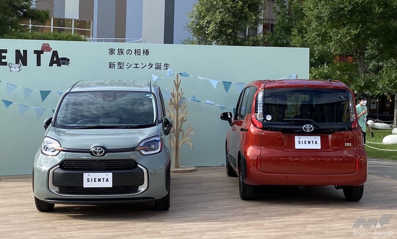 ステージに展示された2台の新型シエンタ。赤いのが「スカーレットメタリック」、もう1台が「アーバンカーキ」のボディカラーだった。