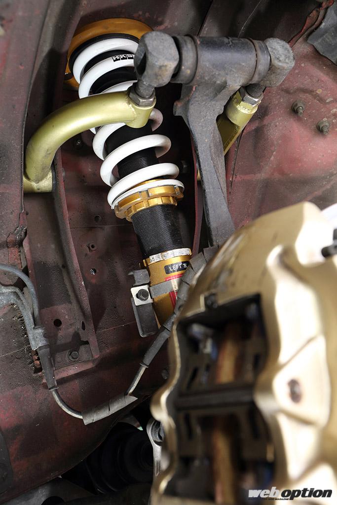 サスペンションはHKSのハイパーマックスMAX-IVで、スプリングレートはフロントが12kg/mmのリヤ10kg/mm。加えてイケヤフォーミュラ製の調整式アームなども投入し、ハイパワーに見合ったコントロール性能を与えている。