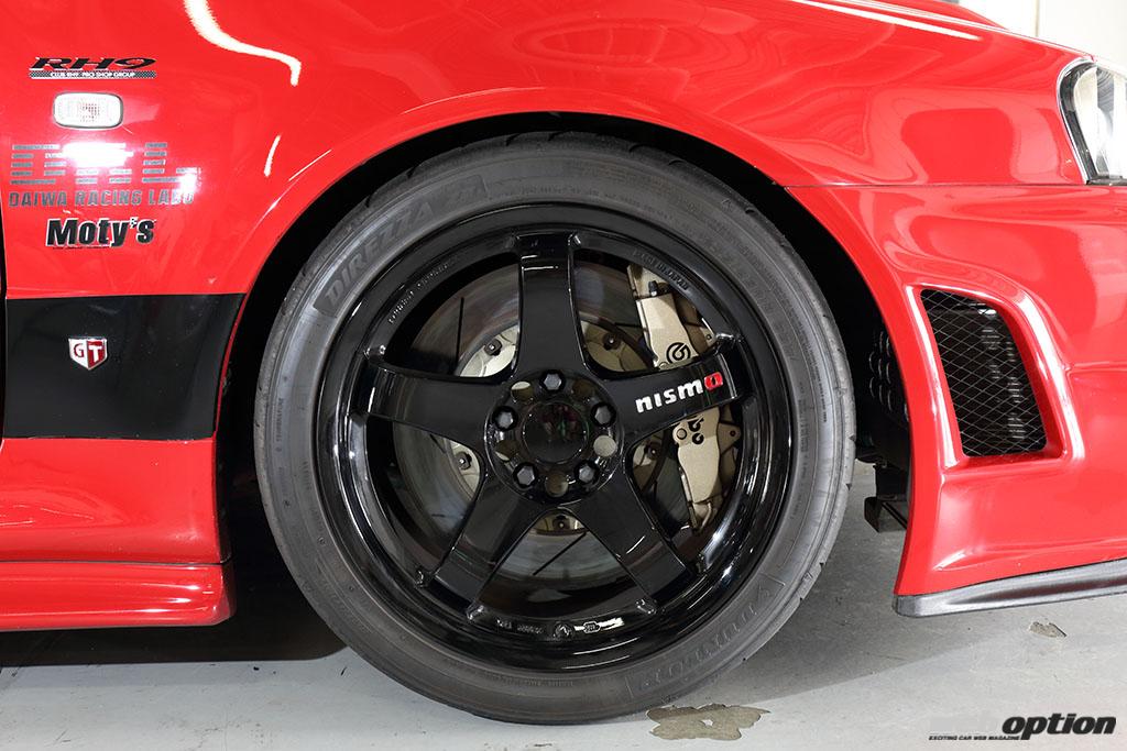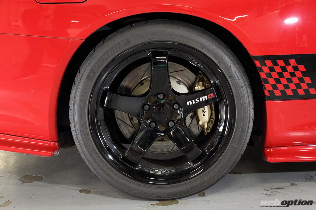 ブレーキはフロントに8ポット、リヤに4ポットのブレンボキャリパーをセットして制動力を大幅に高める。ホイールはニスモLMGT4の10.5J×18インチで、タイヤにはディレッツァZIIスタースペック(275/35-18)を組み合わせる。