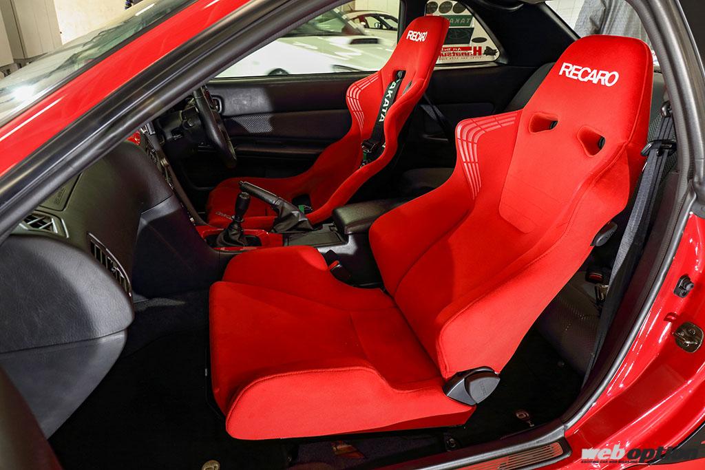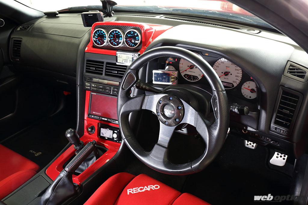 ストリート仕様ということでオーディオやエアコンは完備。純正のマルチファンクションメーターを廃して、デフィの油温、水温、ブースト計がセットされている他、メインメーターもニスモの320km/hスケールホワイトメーターへと交換されている。レッドのレカロシートが映えるインテリアメイクだ。