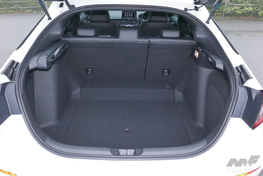 ホンダ・シビック e:HEV 全長×全幅×全高:4550mm×1800mm×1415mm ホイールベース:2735mm 車重:1460kg サスペンション:Fマクファーソンストラット式/R トーションバー式 駆動方式:FF エンジン 形式:直列4気筒DOHC 型式:LFC 排気量:1993cc ボア×ストローク:81.0mm×96.7mm 圧縮比:13.9 最高出力:141ps(104kW)/6000rpm 最大トルク:182Nm/4500rpm 燃料供給:DI 燃料:レギュラー 燃料タンク:40ℓ モーター H4型交流同期モーター 最高出力:184ps(141kW)/5000-6000rpm 最大トルク:315Nm/0-2000rpm WLTCモード燃費:24.2km/ℓ 市街地モード 21.7km/ℓ 郊外モード 27.6km/ℓ 高速道路モード 23.4km/ℓ 車両価格:397万8700円
