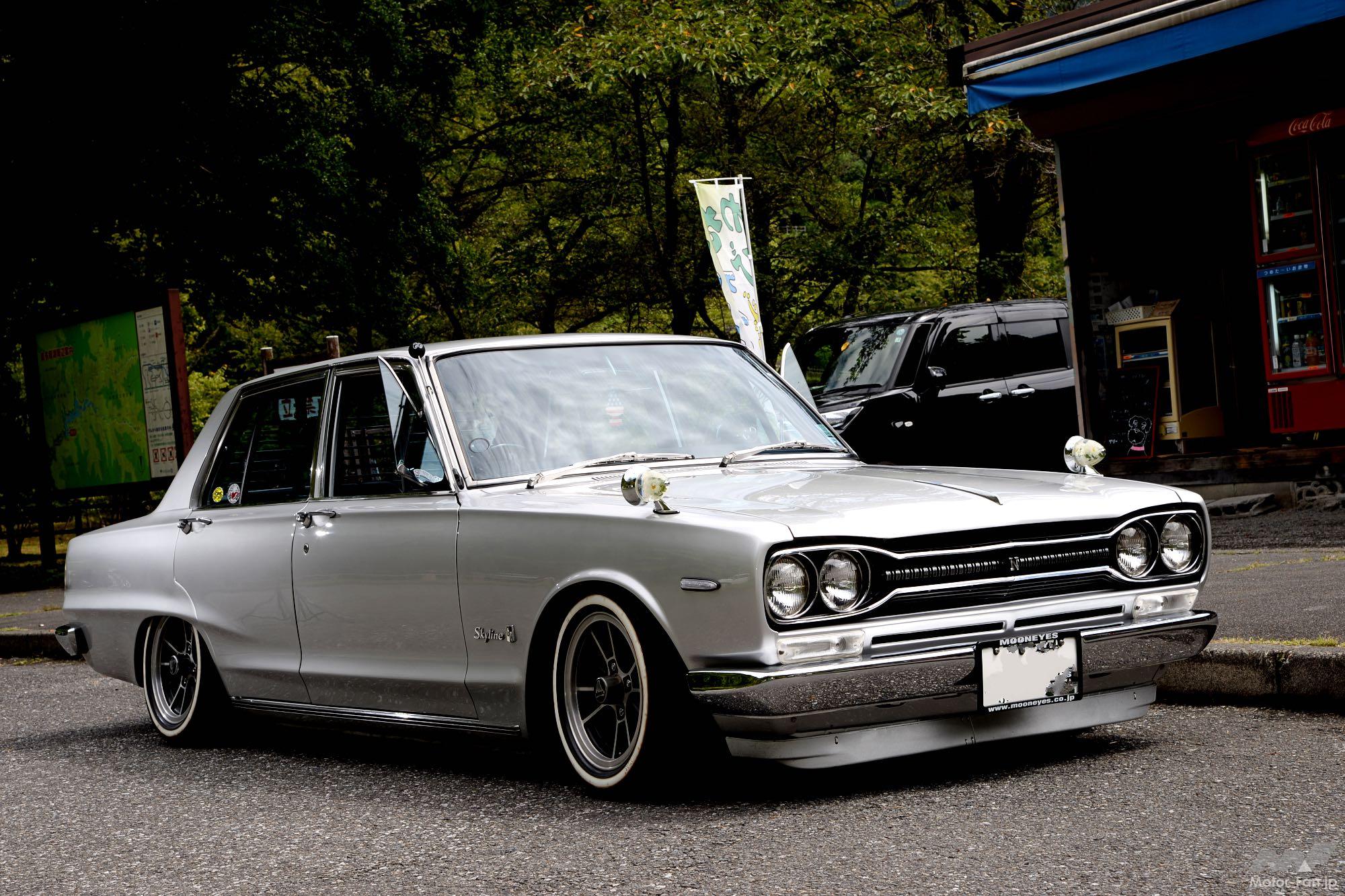 8月21日に東京・奥多摩湖畔にある大麦代園駐車場で開催された東京旧車会は朝方の雨で参加台数が少なかったものの、時間の経過とともに天気が回復するとチラホラ古いクルマの姿が見受けられるようになった。そのうちの1台がこのハコスカ。車高が低くなっているものの、比較的ノーマルな外観を維持している。実はこれ、ハコスカにあっては珍しい。というのも、多くの場合GTをGT-R仕様にするためリヤスタイルの要であるサーフィンラインをカットしてオーバーフェンダーが装着されてしまうから。ところがこのスカイラインはフェンダーラインをしっかり残してあり、GT-R仕様にされていないことに好感が持てた。GT-R仕様にするため純正のブルーガラスを白ガラスにしてしまうことも多いが、やはりこのスカイラインはブルーのまま。そこでそばにいたオーナーに話を聞いてみることにした。