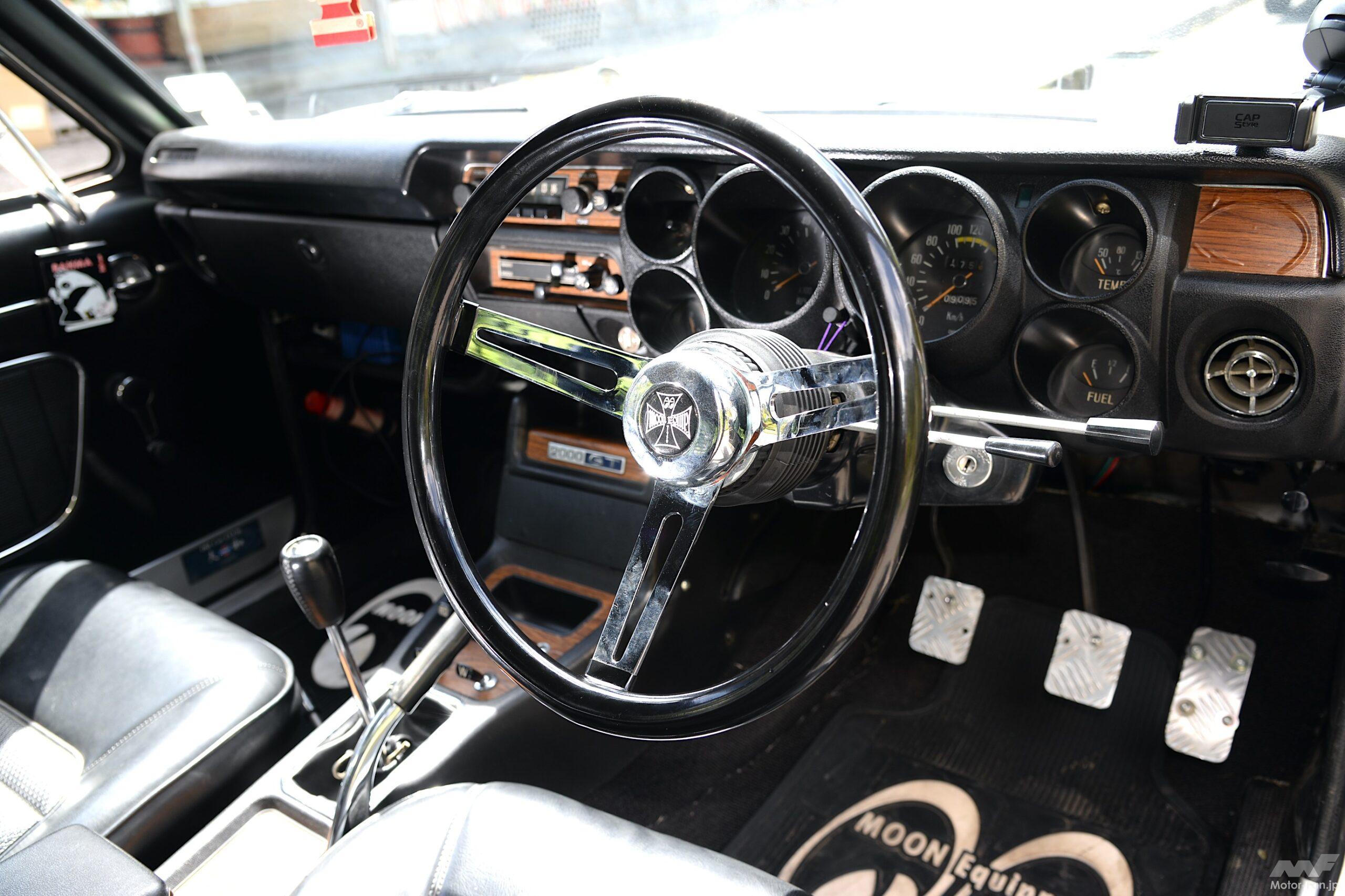 ただし、購入時に「ノーマルで乗ってほしい」と店主から告げられた。というのも、これだけ程度がよくオリジナル状態をキープしたスカイラインは珍しいため、派手な改造や元に戻せないようなカスタムをして欲しくなかったからだ。三ツ森さんも心得たもので、いつでも元に戻せる程度にしかカスタムしない。それがこのスカイラインの放つオーラになっているようだ。変更したのは車高調サスペンションによりローダウンしてアルミホイールを履いたほか、後期モデルのフロントグリルとテールランプを中期モデル用と入れ替えたくらい。フロントフェンダーのクリアウインカーが510ブルーバード用だったり、エアダム風のフロントリップスポイラーなどはいつでも脱着可能。貴重なボディだからサーフィンラインをカットすることなど考えもしなかったそうだ。