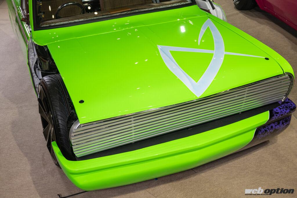 ボディワークの基本は先輩が製作したスタイルを活かしながら、バンパーをスムージングしさらにファントムグリルをセット。ペイントに関しては90’s後半~2000年代のトラッキンをイメージし、蛍光グリーンをベースにトライバル柄を取り入れることで、よりショーカーらしさをアピールする。