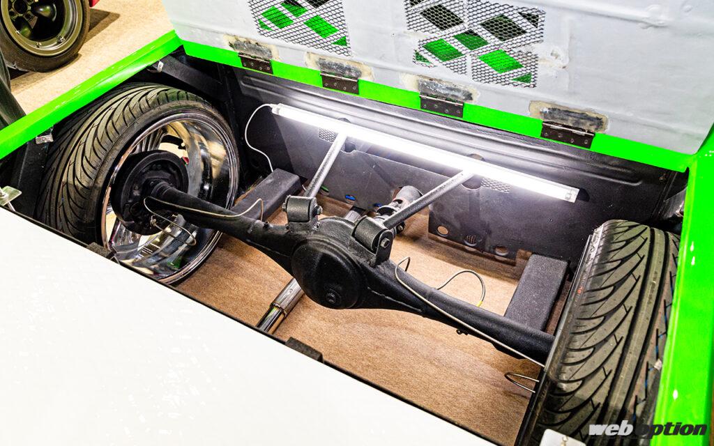 細部を見ていく。まずはトラッキンの特徴のひとつである、着地するほどのドシャコタンを実現するため足回りのカスタムに着手。4リンク式のマルチリンク化を施し、フロア下にエアサスを組み込むことでこれだけのシャコタン化に成功した。