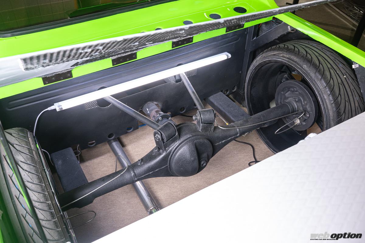 18インチ7.0Jのホイールをフェンダー内に納めるにはトレッドの縮小が必要なため、インナーフェンダーをバッサリとカット。サスタワー位置は、ちょうどタイヤ1本分イン側へオフセットさせている。