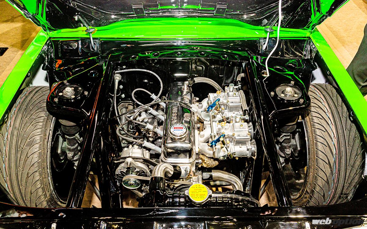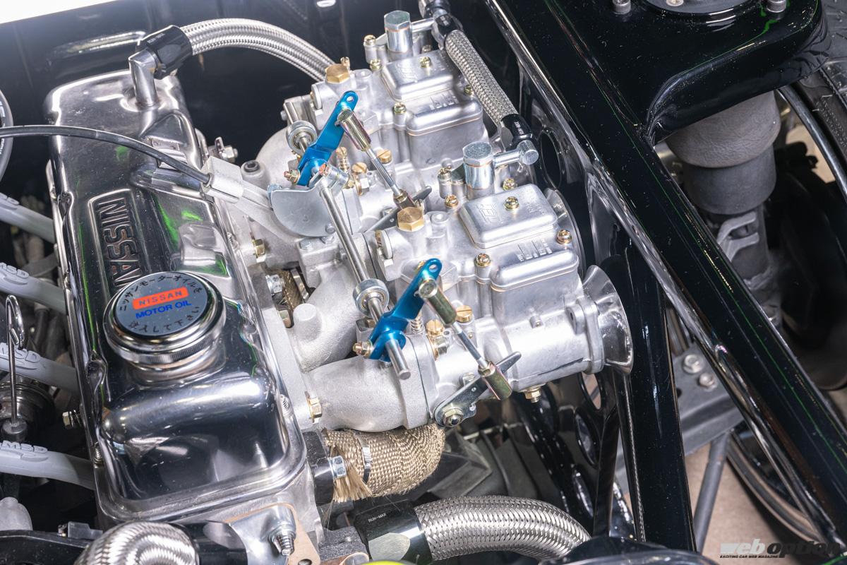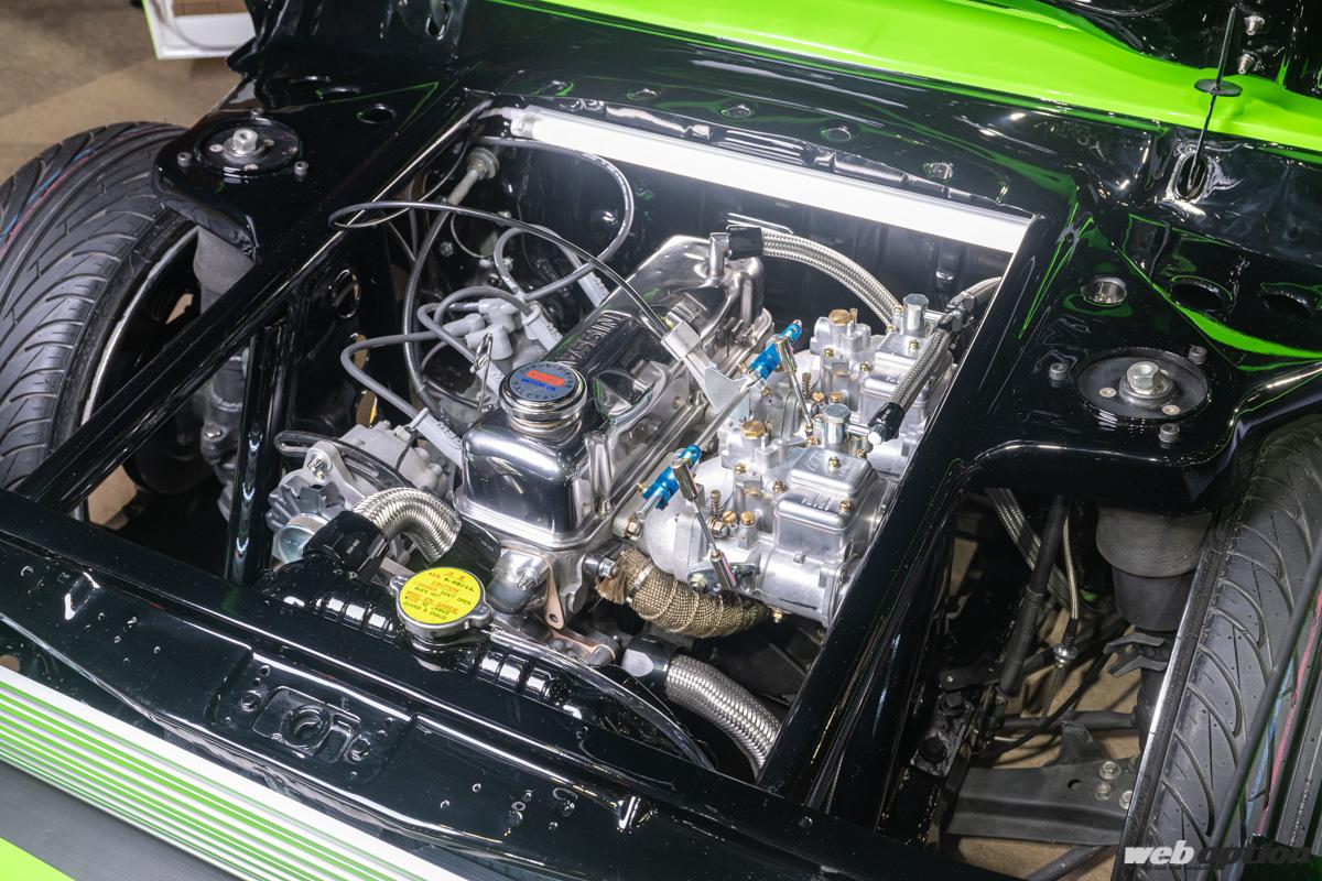 エンジンルームの見栄えも気にしてOERのキャブとステンレスのタコ足へ交換。メッキのように輝く各パーツは学生達が手作業で磨き上げた力作だ。