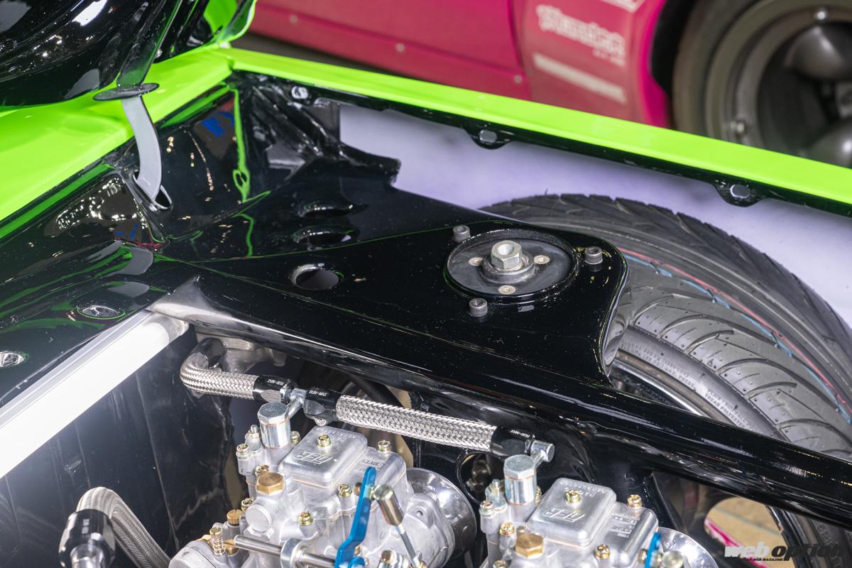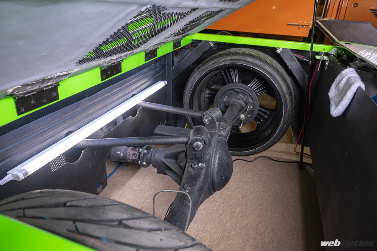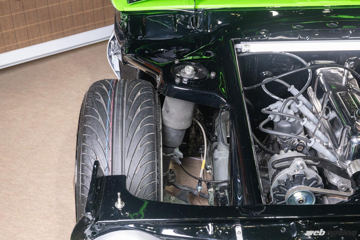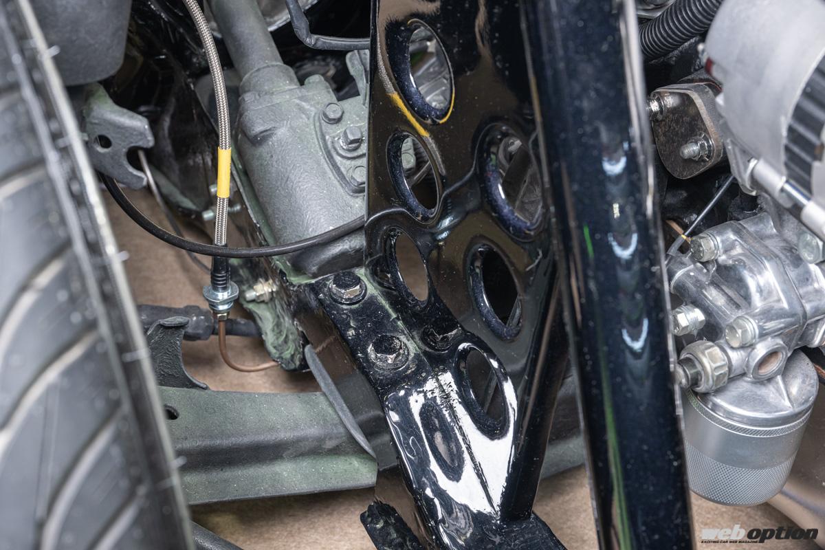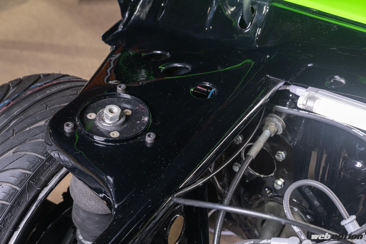そして、地上高を確保する目的でフロントメンバーはマウント部のフレームを40mm上方へ移動。サスタワーのバーリング加工といったディティールへの拘りも忘れない。