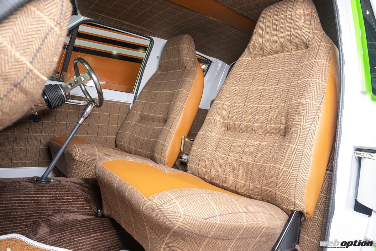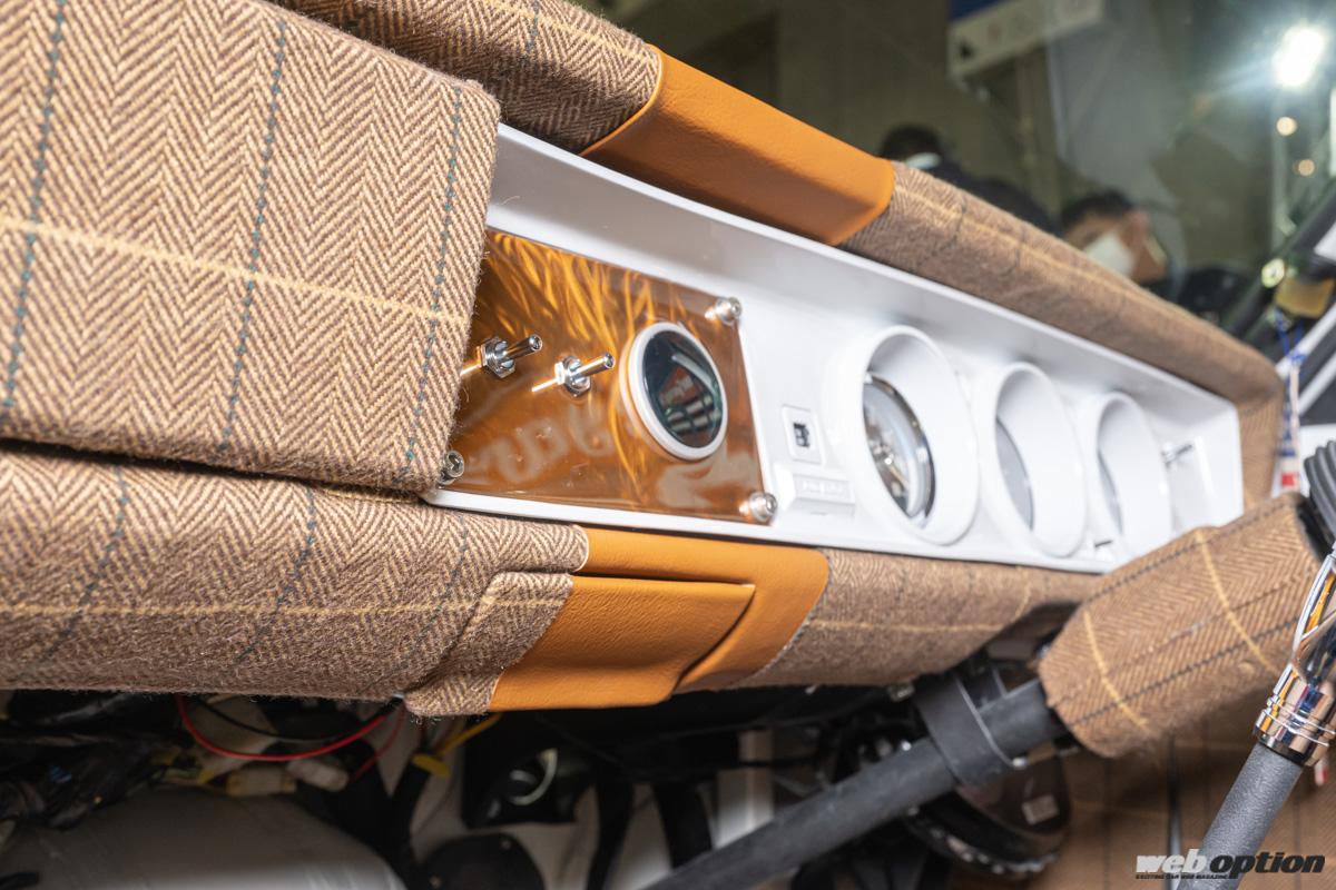 インテリアカスタムも徹底。純正シートの張り替えは外注だが、一般的な自動車用シートの加工を手掛けるショップではなく、家具のリメイクを得意とする専門店に依頼。これにより、一風変わった雰囲気に仕上がったという。