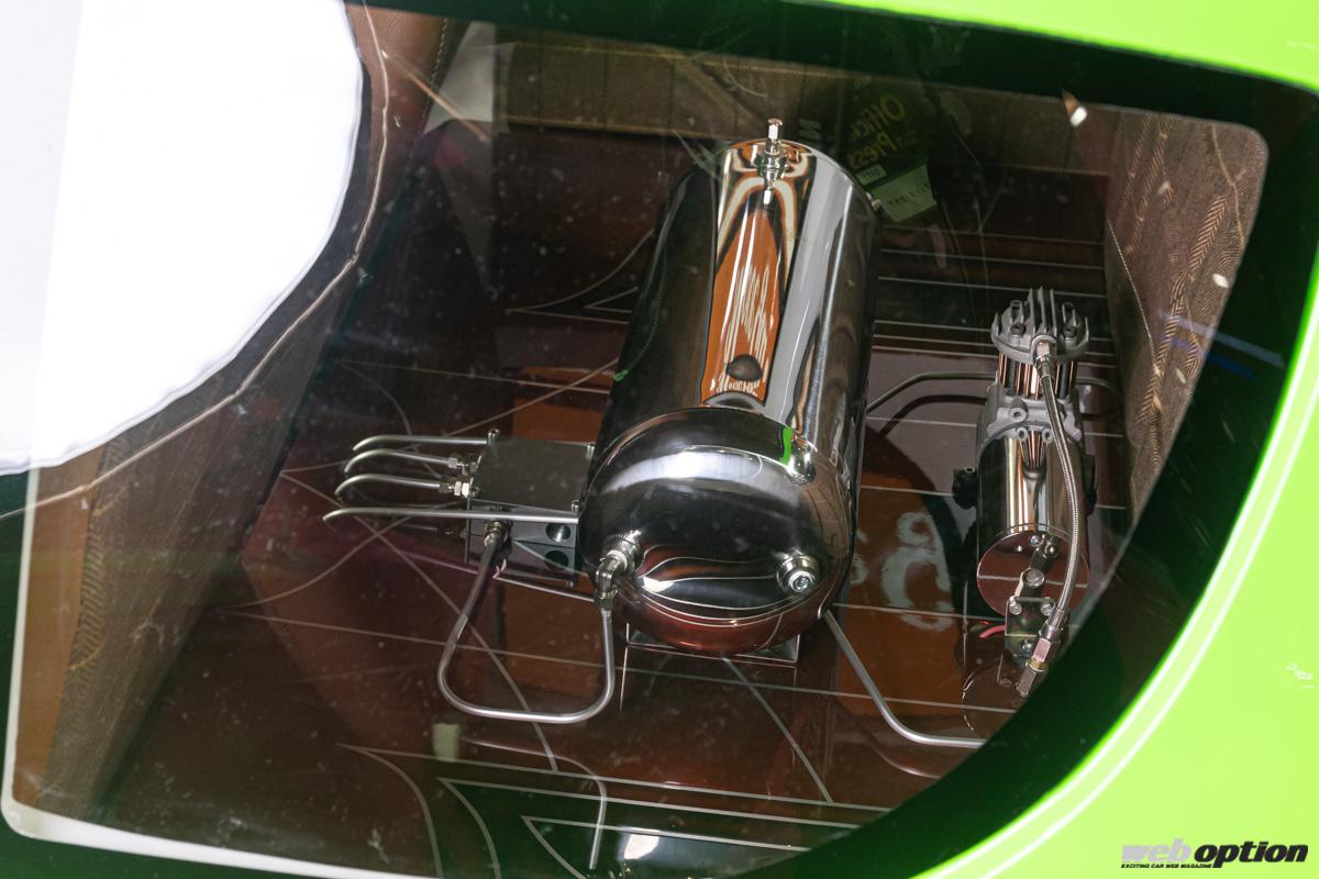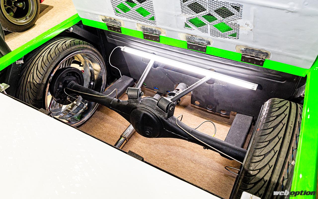 細部を見ていく。まずはトラッキンの特徴のひとつである、着地するほどのドシャコタンを実現するため足回りのカスタムに着手。4リンク式のマルチリンク化を施し、フロア下にエアサスを組み込むことでこれだけのシャコタン化に成功した。