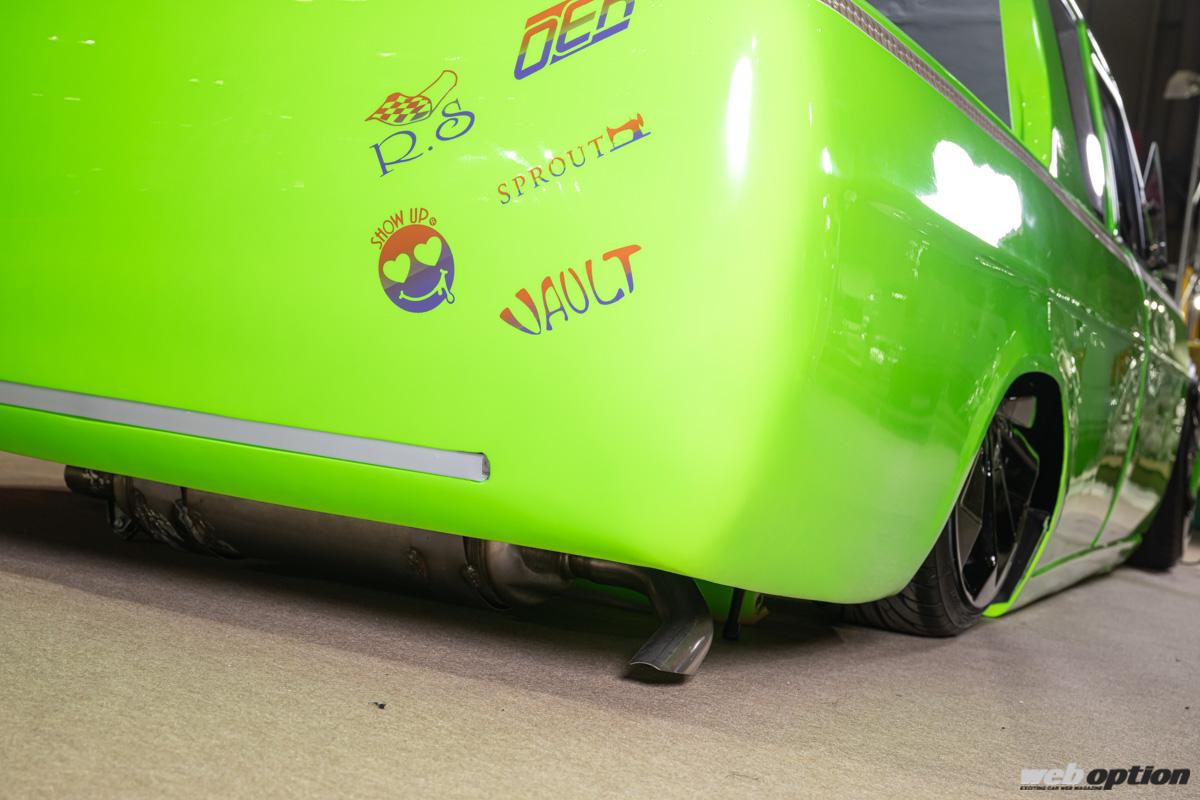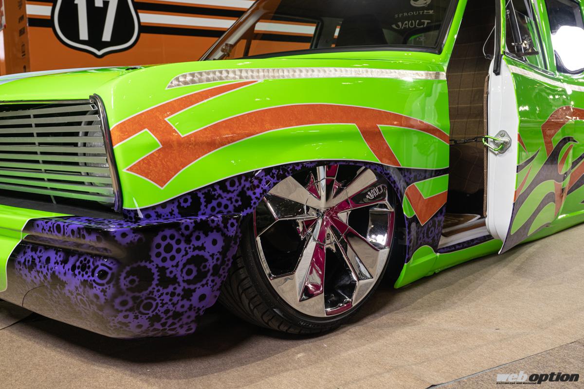 ボディワークの基本は先輩が製作したスタイルを活かしながら、バンパーをスムージングしさらにファントムグリルをセット。ペイントに関しては90’s後半~2000年代のトラッキンをイメージし、蛍光グリーンをベースにトライバル柄を取り入れることで、よりショーカーらしさをアピールする。