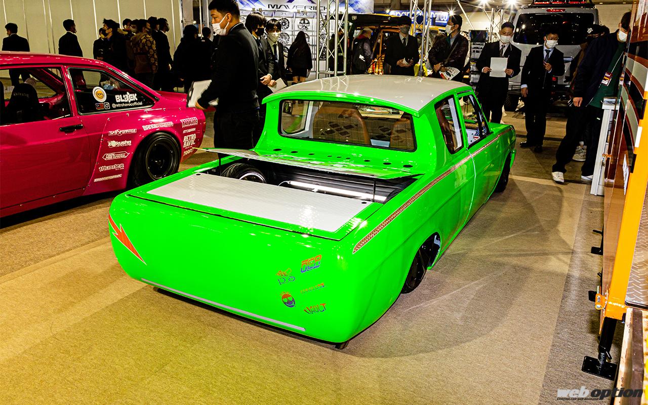 ベースとなるのは10年ほど前に同校の卒業生が製作したサニトラ。シングルキャブのキャビンを拡大し、マツダ・ポーターのルーフエンドを取り入れるエクストラキャブ仕様に作り変えた車両だ。このボディスタイルをそのままに、パイプフレームで組み直したフロントにはエアサスをワンオフフィット。さらに、リヤエンドも4リンク化しつつフレームもステップノッチで仕上げて、スラムドを実現しているのだ。