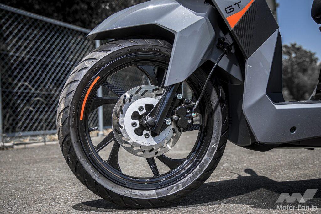 ツイート125GTには前後16インチタイヤが装着してあります。これは欧州に多い石畳の道での走行に配慮したもので、実際に荒れた路面での走破性は、小径タイヤのモデルに比べて高いです。さらに1330㎜とホイールベースも長めなので、直進安定性は高いと感じました。