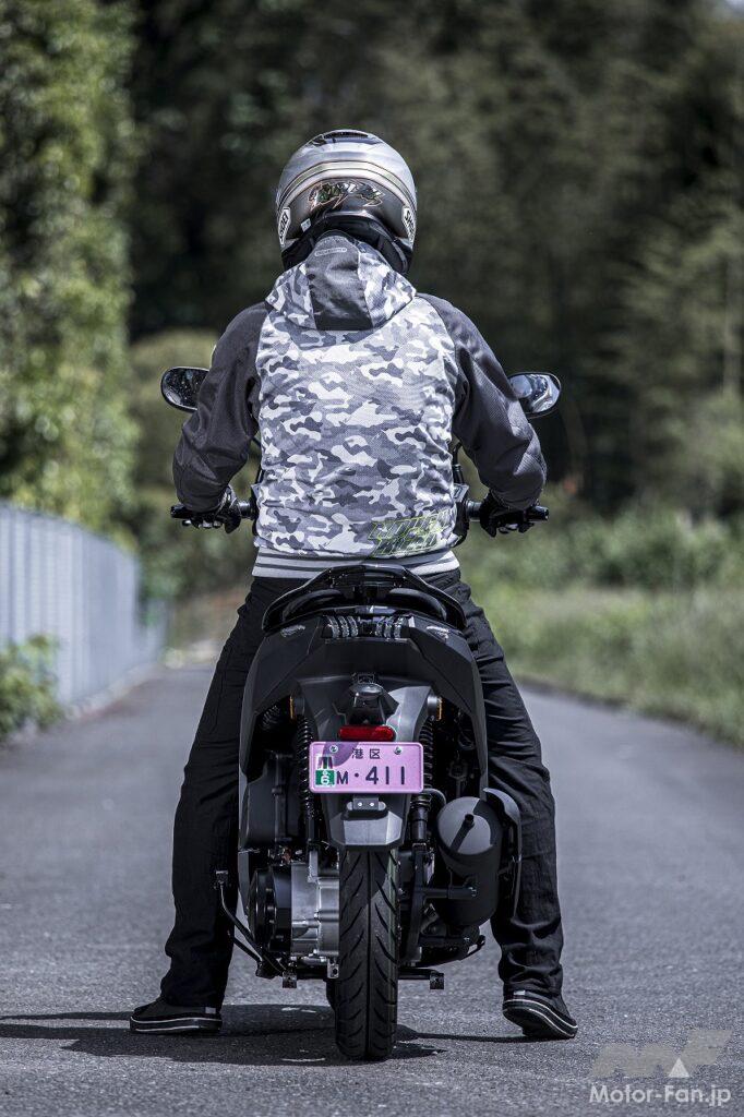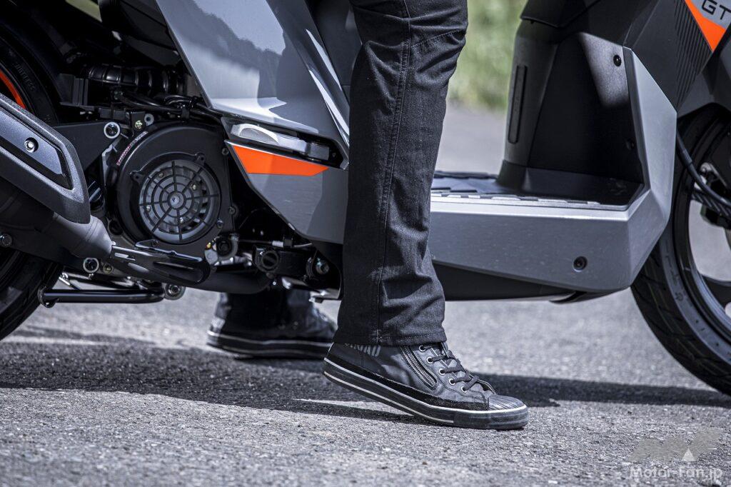 乗車するとやはりポジションにゆとりがあります。前後16インチタイヤを装着し、シート高も790㎜あるので、足つき性が抜群というわけにはいきませんが、ステップスルータイプのフラットフロアは乗降性が良く、気軽に乗れるというスクーターの特色がしっかり感じられます。