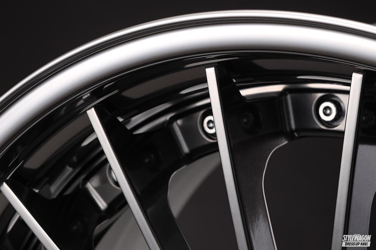 センターパートにエアロディッシュを意識した、面を強調した造形を採用することで重厚感も演出。ただしメインとなるスポークはシンプルで極細だから、軽量化にも寄与できる点は大きなメリットだ。そのスポークは先端がアウターリムにマウントするリムオーバーディスク形状となっていて、細さも手伝って足長感が絶大に。太陽から放射状に放たれる光をイメージしたラジアル形状ディスクとなるのもイリオスCVならではである。