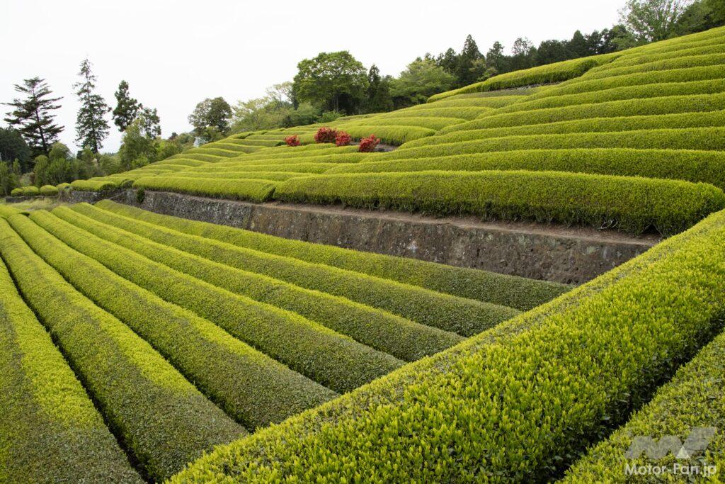 アクセスは新東名高速道路の新富士ICから10分程の位置。現地付近の道路が狭く少し見つけにくいかもしれないが、アプローチにある道の森を抜けた時、目の前に広がるお茶畑の美しさには感激。ナビ利用の場合は、大淵1516番地の「旧藤田邸」を目的地に設定すれば第二駐車場に到達し、さらに奥へ進むと撮影スポットにより近い第一駐車場に到達。あれやこれやとお店で賑わう観光地ではない。しかし、ビューポイントとして最高のロケーション。ツーリング途中で一服するのにお薦め。その後は海鮮ランチを求めて清水港や沼津港を目指すにも好都合な場所にあるのだ。