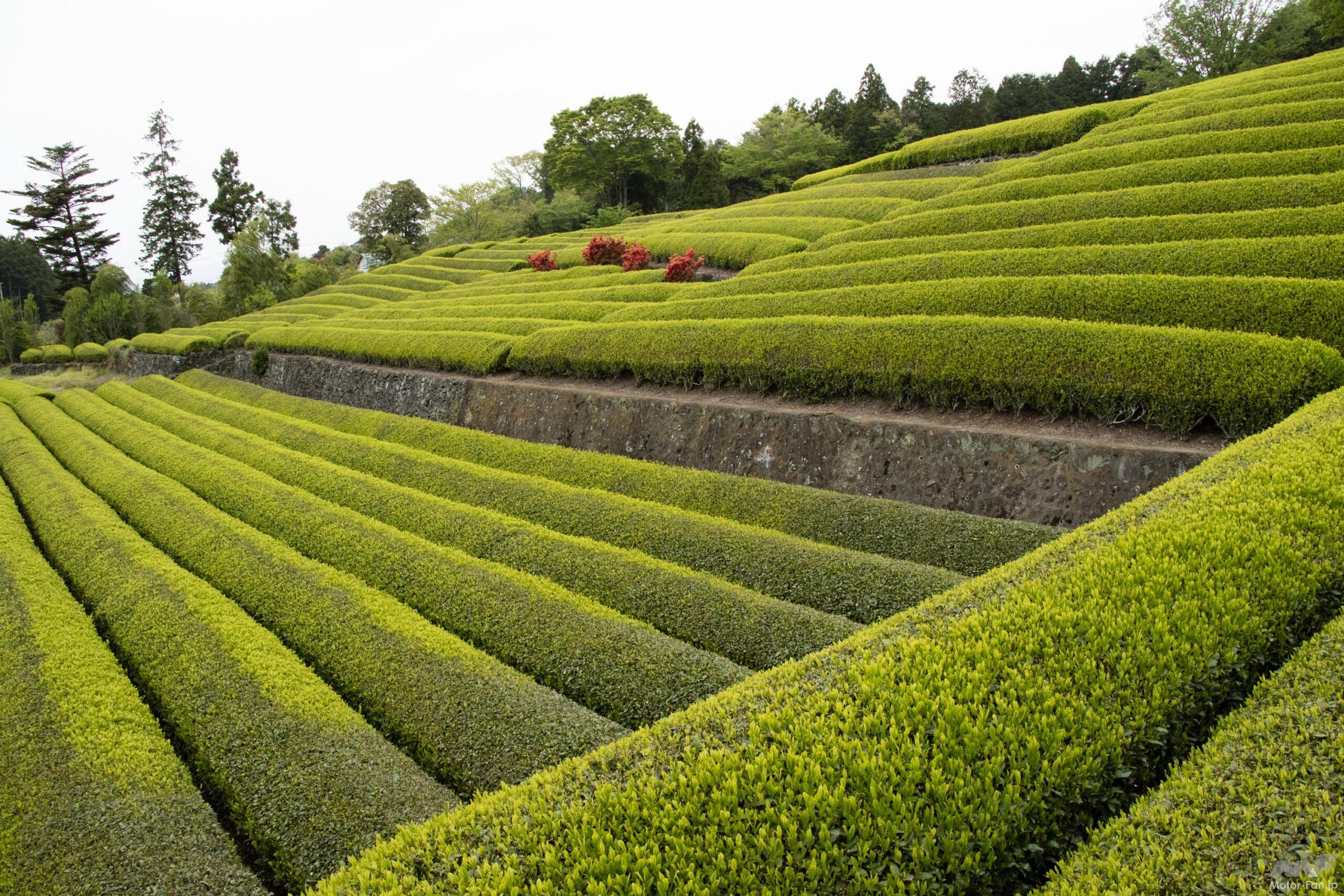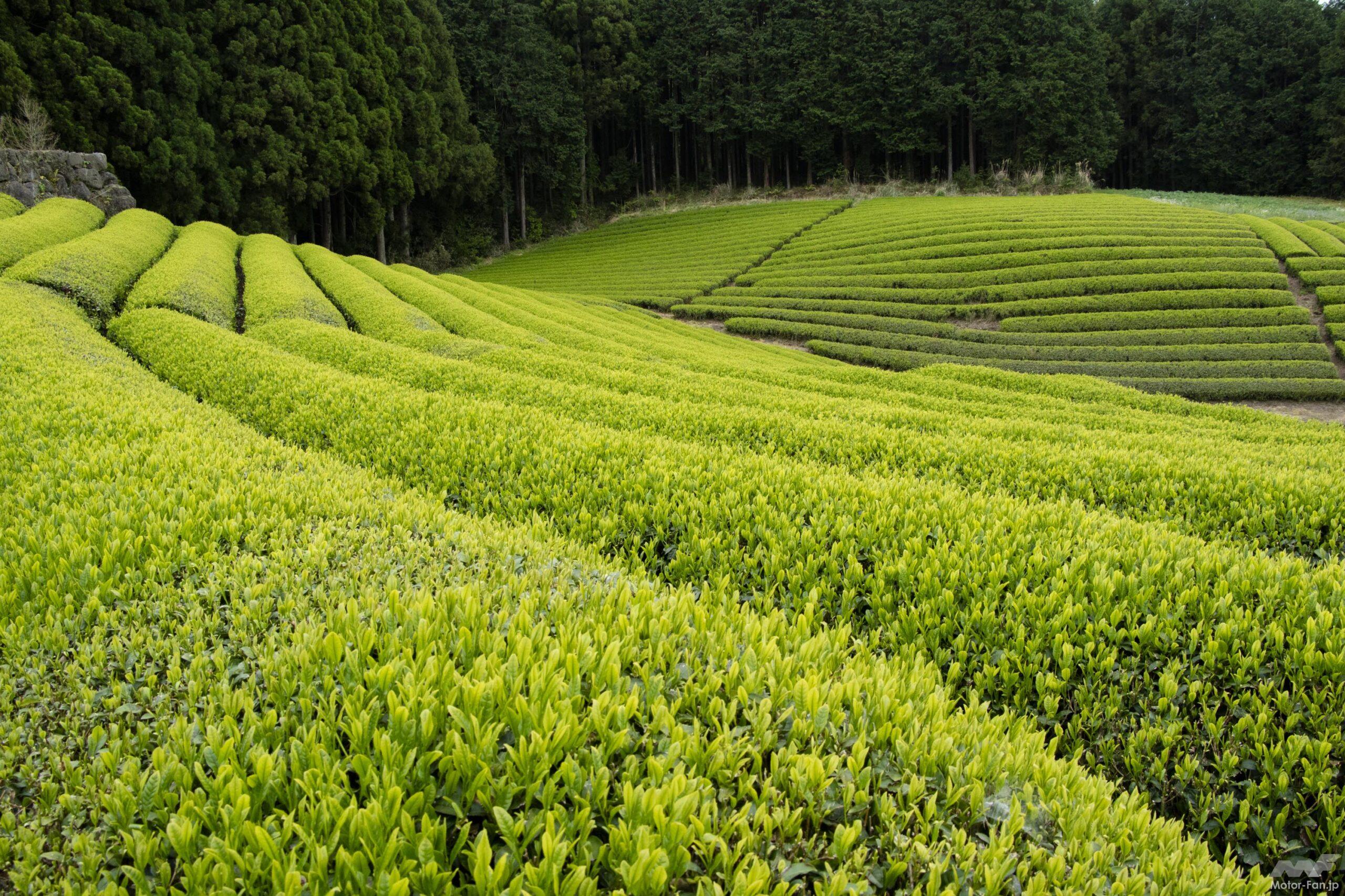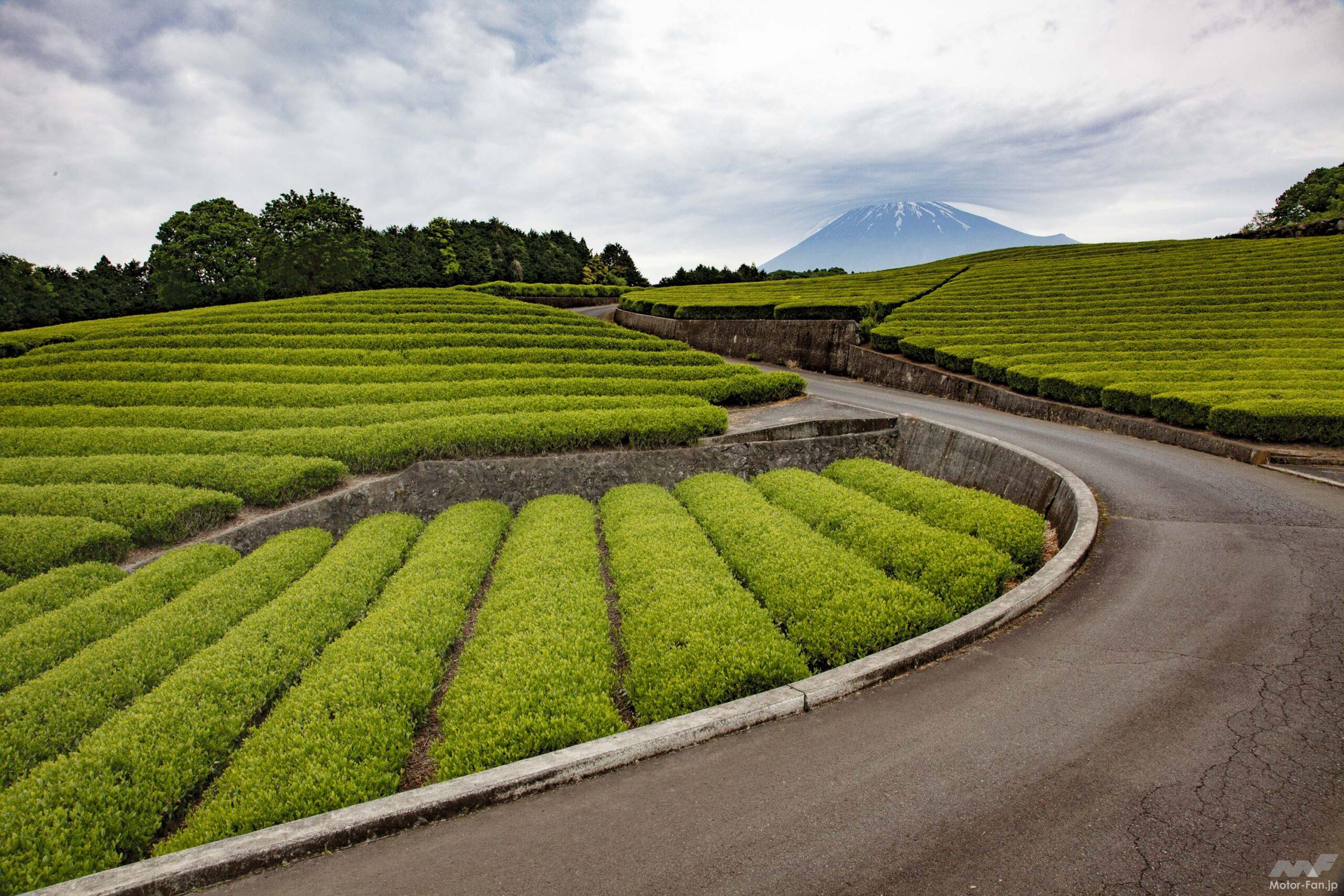 アクセスは新東名高速道路の新富士ICから10分程の位置。現地付近の道路が狭く少し見つけにくいかもしれないが、アプローチにある道の森を抜けた時、目の前に広がるお茶畑の美しさには感激。ナビ利用の場合は、大淵1516番地の「旧藤田邸」を目的地に設定すれば第二駐車場に到達し、さらに奥へ進むと撮影スポットにより近い第一駐車場に到達。あれやこれやとお店で賑わう観光地ではない。しかし、ビューポイントとして最高のロケーション。ツーリング途中で一服するのにお薦め。その後は海鮮ランチを求めて清水港や沼津港を目指すにも好都合な場所にあるのだ。