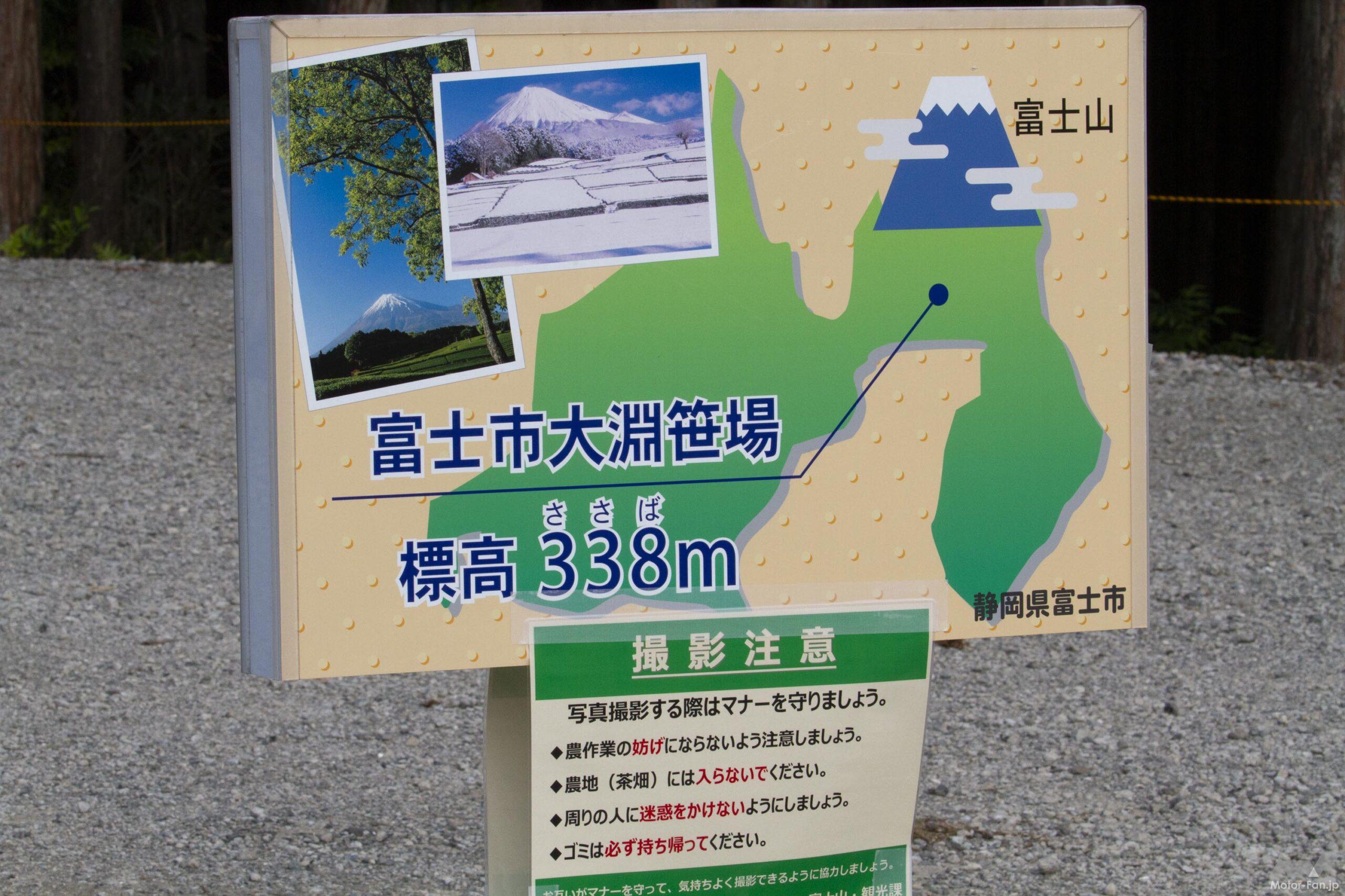 現地近くには「大淵笹場」を示す看板も立っている。2ヶ所ある駐車場には綺麗なトイレが設備されているのも嬉しい。近くには売店もある。富士市のホームページでも「富士山と茶畑の絶景スポット」と説明している。