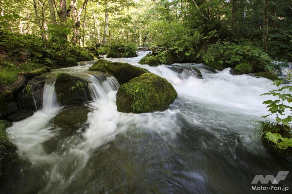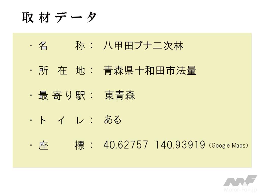 流石に国立公園の中だけに、特に紅葉シーズンは観光客も多くの車で賑わいますが、景色は季節に関係なく最高の素晴らしさ。これから夏にかけて、あたり一面が緑に覆われる景観は、ため息が出るほど綺麗です。公衆トイレもアチコチにあるので安心。103号線を南下し、国道102号線、あるいは同454号線を左折して東に進めば八戸市へと出られる。103号線をそのまま進めば、右(西)側に十和田湖が出現。さらに進み、県道2号線(樹海ライン)を経由すれば、東北自動車道路の十和田インターチェンジに出られる。