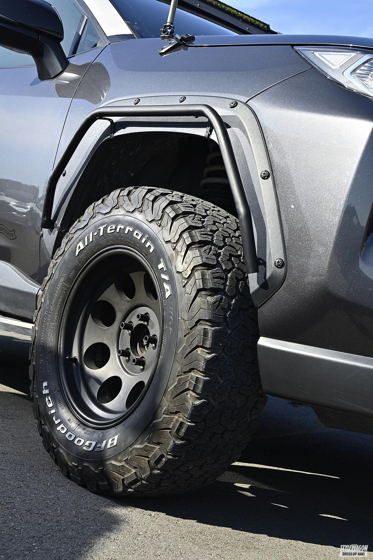 以前はハイラックスサーフをチョイ上げして乗っていたが、本腰を入れてイジり始めたのはこのRAV4から。フロントのブルバーはハイラックス用を加工。今回のミーティングに参加するにあたり、前日に自分でチッピング塗装。美しさを取り戻した。パイプフェンダーも自作で、素材はスチールではなく塩ピ管を加工。パッと見は分からない。