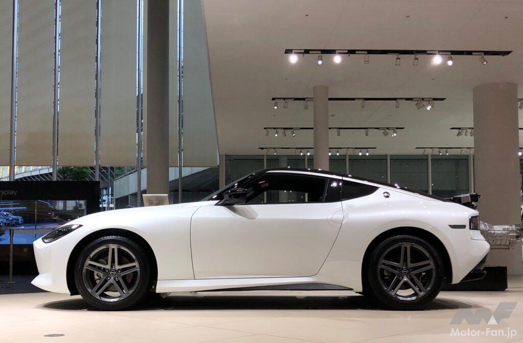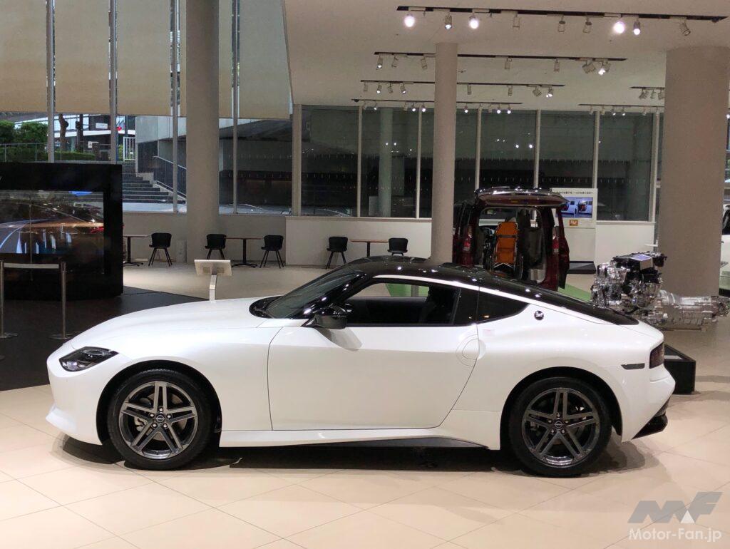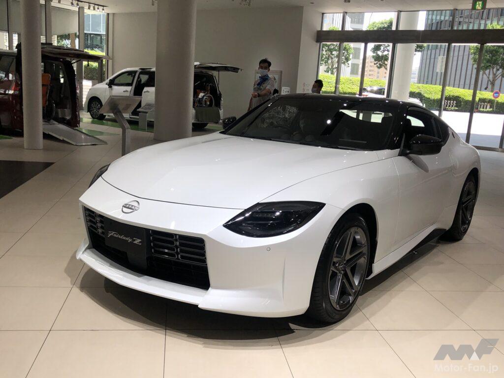 日産グローバル本社ギャラリーを訪れてみると、まだあまり見る機会のない、ブラック、ホワイトの二台が展示されていた。ミッドナイトブラックの「バージョンST 6MT」と、プリズムホワイトの「ベースグレード 9AT」である。MTとAT、一番上と一番下、黒と白とそれぞれ対照的かつ印象的で、ファンの気持ちを分かった陳列に感謝! ボディカラーによって全く違うクルマに観えるほど表情を変える新型Zのエクステリアデザインが、強く印象に残った。