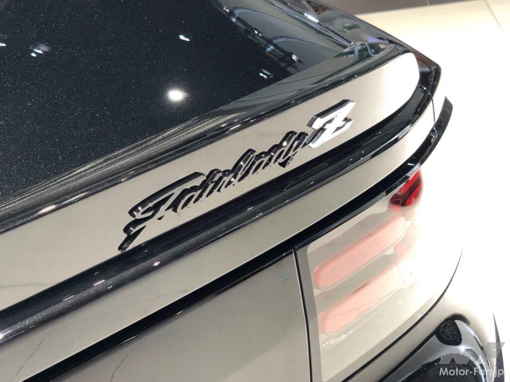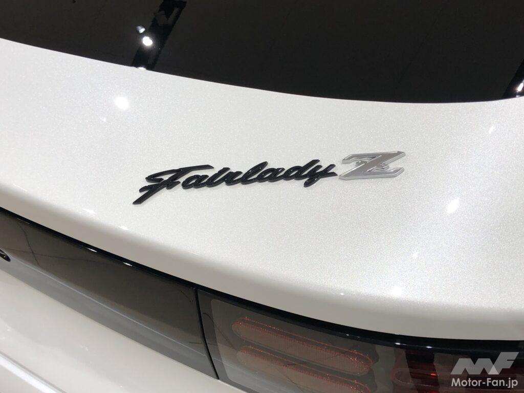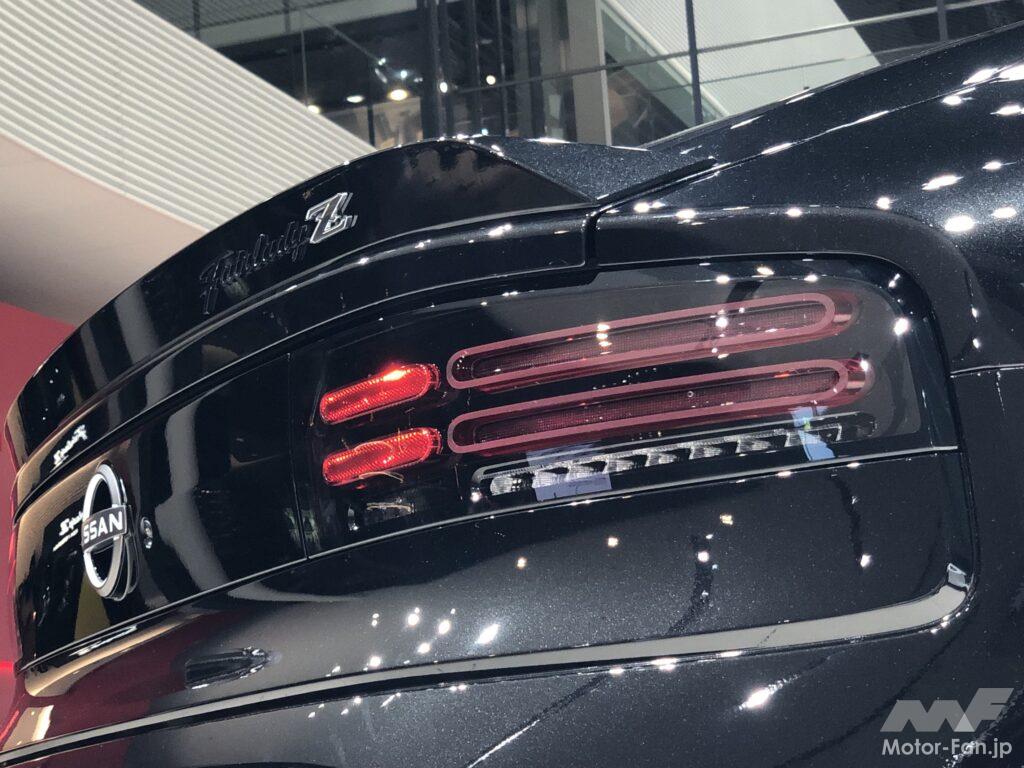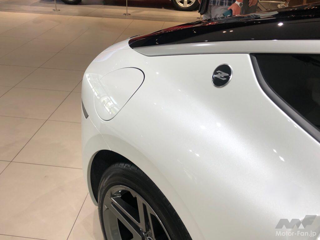 リヤは大きなブラックルーフとの2トーンとディフューザー、ブラックアウトされたテールランプ周りによって薄く、ロー&ワイドのフォルム。この刀をモチーフとしたシルバーラインからのデザインは新型アリアを彷彿とさせる新しい日産のデザインだ。美しいリヤフェンダーの膨らみ際立つ。ベースグレードはリヤスポイラーがないため、リヤゲートの美しさがよくわかる。またここに斜めに入る「Fairlady Z」のエンブレムはS30を彷彿とさせる演出で実に魅力的だ。