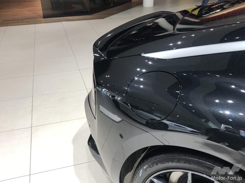 サイドビューは観る高さによって、様々な表情に変化する。ブラックベゼルによってノーズとボンネットはとても低く見える。ウインカーがなく、ドアハンドルも目立たないため、フロントフェンダーからドアまでの面が実に美しい。シルバーの18インチホイールとキャリパーも控えめで、これはこれでイイ!ホイールアーチの下端はタイヤを包み込むように拘ってデザインして生産効率よりも美しさを追求している。