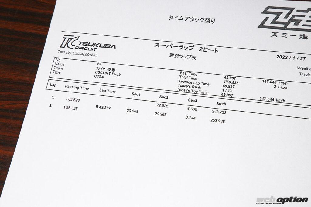 各地のサーキットでコースレコードを塗り替え、日本が誇るタイムアタックマシンの1台として注目される存在にまでなったエスコート&安藤佳樹選手のランエボ9(CT9A)。このスーパーチューンドが、ついに筑波サーキット50秒の壁を打ち破る快挙を成し遂げた。ベストタイムは49秒897だ。