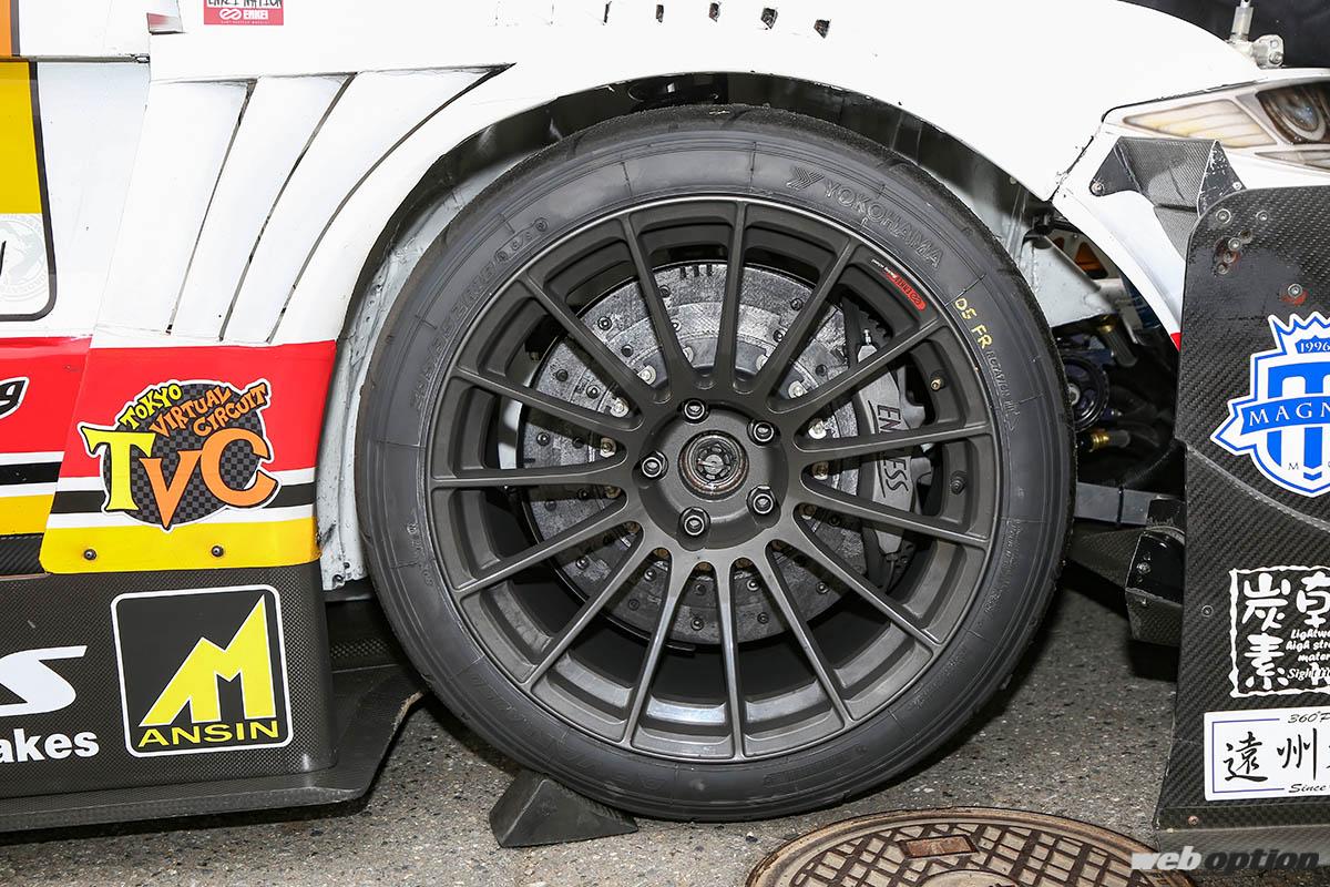 タイヤはフージャーDOTラジアルを筆頭に様々な銘柄を試してきたが、今回は前後295/35−18サイズのアドバンA050(G/Sコンパウンド+削り)を採用。ホイールはエンケイNT05RRだ。