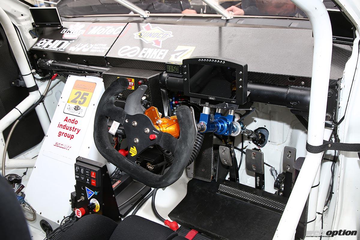 室内のメイキングも凄まじい。ダッシュボードはドライカーボンパネルで作り直されており、そこにランエボ9の面影は残されていない。ステアリングは上部がカットされたジュニアフォーミュラ系の『MOMO 12C』、メインメーターはモーテックのC187カラーディスプレイロガーだ。メーカー脇にはデジタル時計が確認できる。