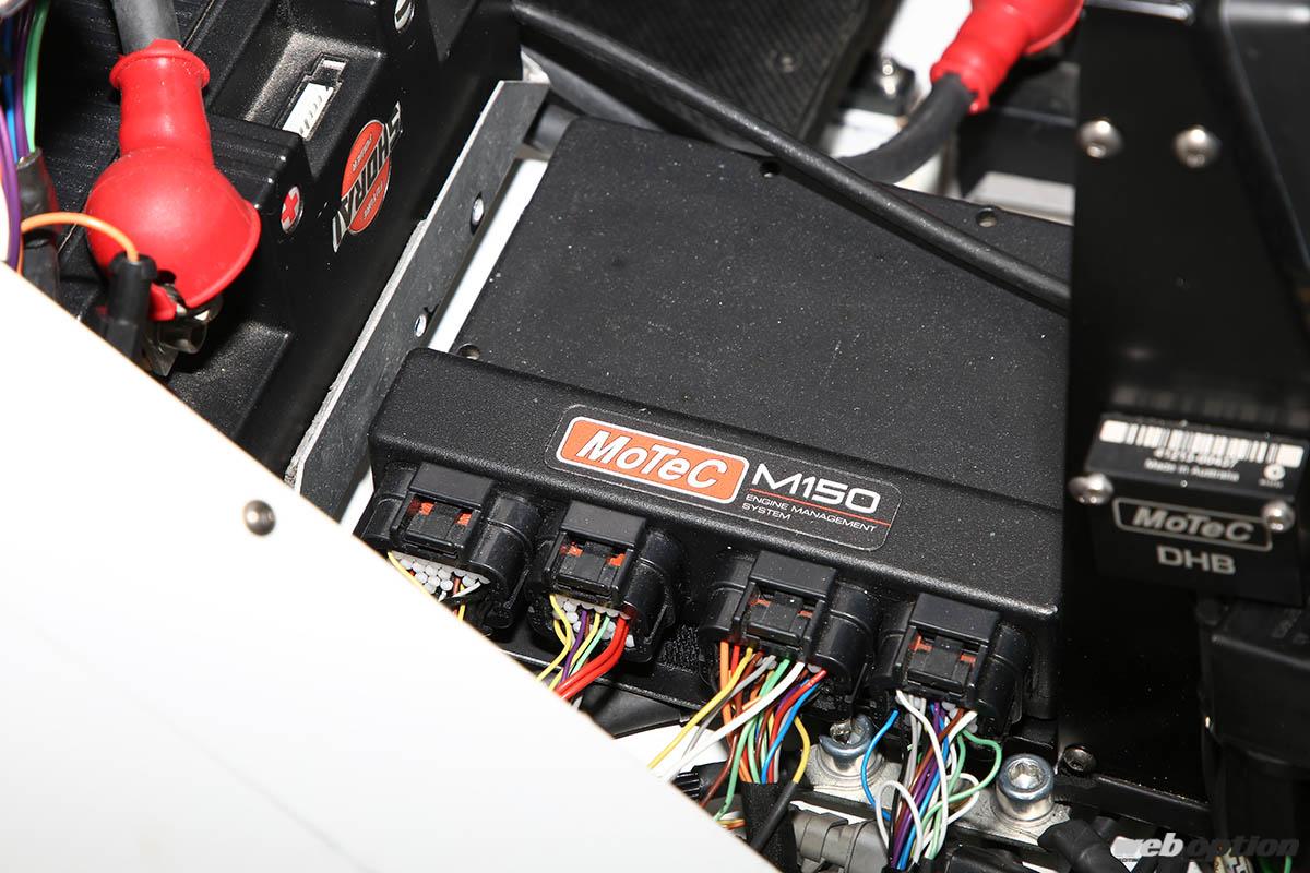 ミッション自体はホリンジャーの6速シーケンシャルだが、操作はIパターンではなくモーテックM150制御によるパドルシフト仕様だ。これにより、電光石火のシフトチェンジを可能にしている。