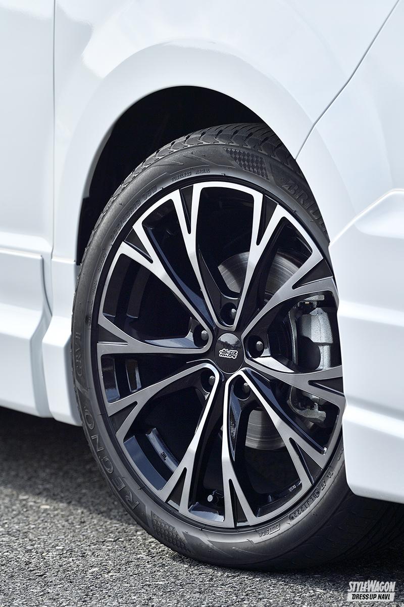 「MY Fast STEP WGN」がコンセプトであることからも分かるように、無限らしいスポーティさと存在感を際立たせたスタイルで、フロントアンダースポイラー、サイドガーニッシュ、リアアンダースポイラーがよりワイド&ローな印象を与えてくれている。特にリアアンダースポイラーは標準マフラーだけでなく、別途用意されるスポーツサイレンサーとの組み合わせも可能。このスポーツサイレンサーは上品かつ迫力のあるチタン製のデュアルフィニッシャーを採用し、ノーマルとは明らかに異なるリアビューを演出してくれているのだ。またフロントグリルガーニッシュは3ピース構成のツヤありブラック塗装とすることで、より精悍なフロントマスクとしてくれるほか、足元には先代モデルでも好評だったアルミホイールのMDWを装着。このアルミホイール、デザインこそ先代用と共通となっているが、3ナンバーボディとなった新型に合わせた新インセットを採用している点も見逃せないポイントだろう。
