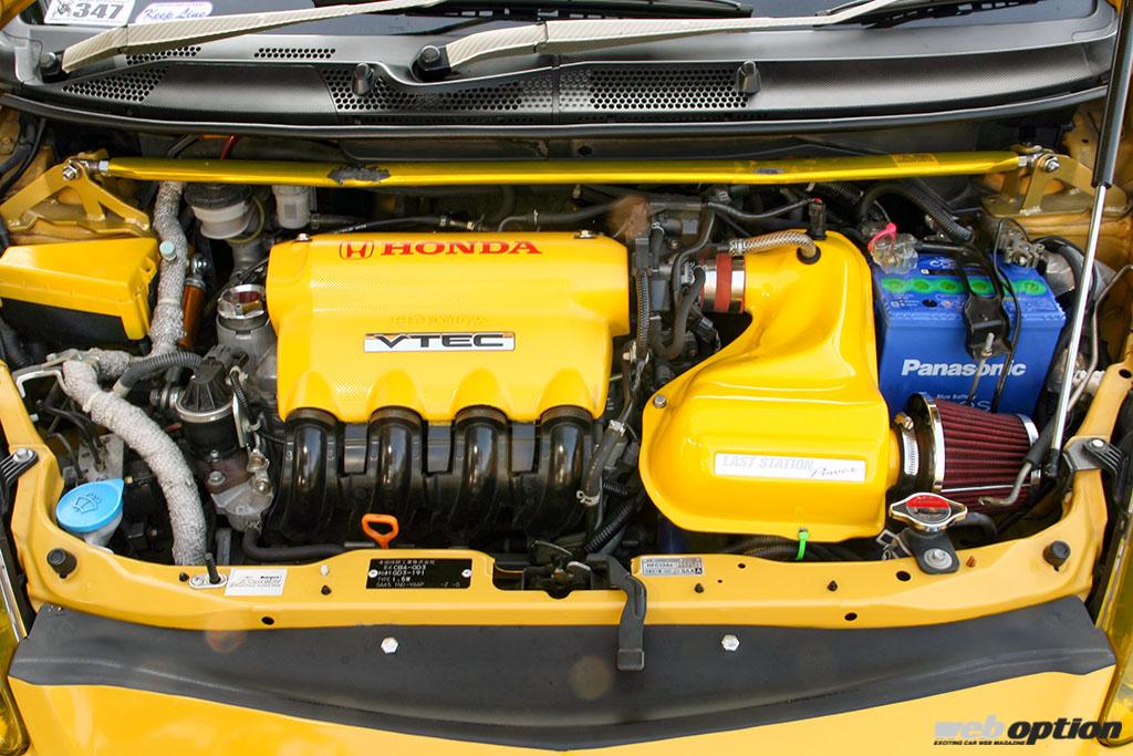 エンジンルームは、ボディカラーに合わせてヘッドカバーやヒューズボックスをイエローにペイント。さらに、タワーバーはイエロー系のラップペイントで統一感を演出する。ちなみに、エンジン本体はノーマルだが、トラストのeマネージで現車セッティングしている。