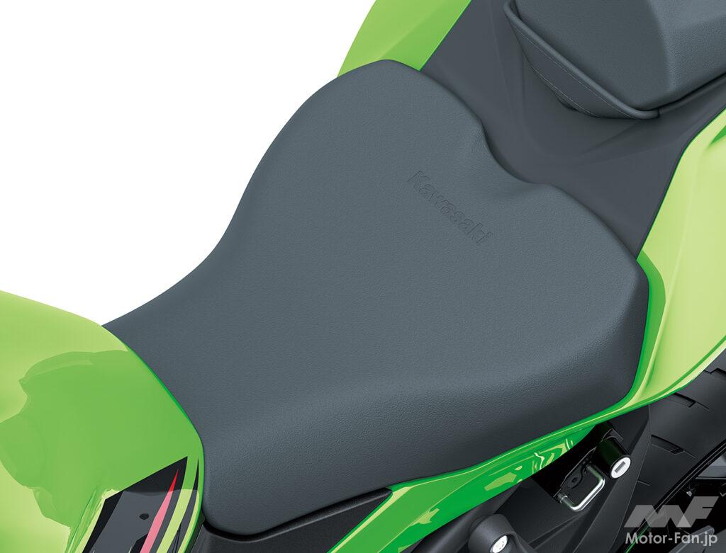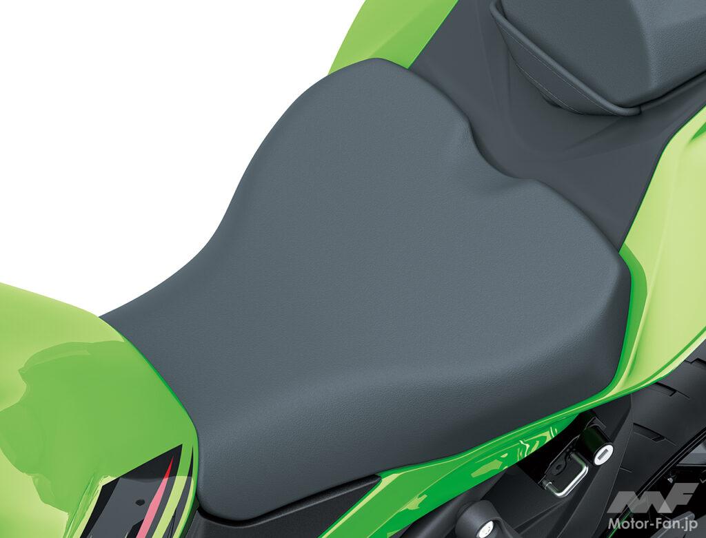 ・ライディングポジションはNinja 400よりもアグレッシブながらリラックス感もあり、ライダーは過度な前傾姿勢を取ることなく、俊敏なスーパースポーツハンドリングを堪能することができる。空気抵抗の低減と防風効果をバランスさせたライディングポジションは、ライダーの自由度も高めている。