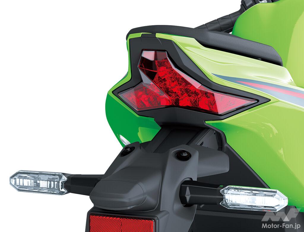 ・Ninja ZX-10RにインスパイアされたLEDテールライトは、リヤ周りにハイグレードな印象を付加。リヤウインカー、ライセンスランプにもLEDを採用。