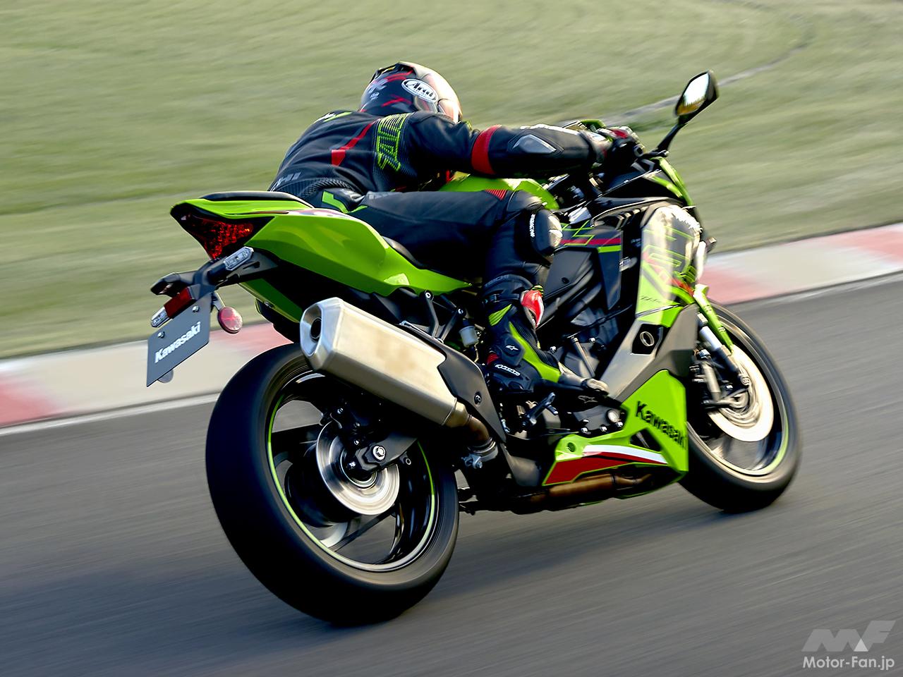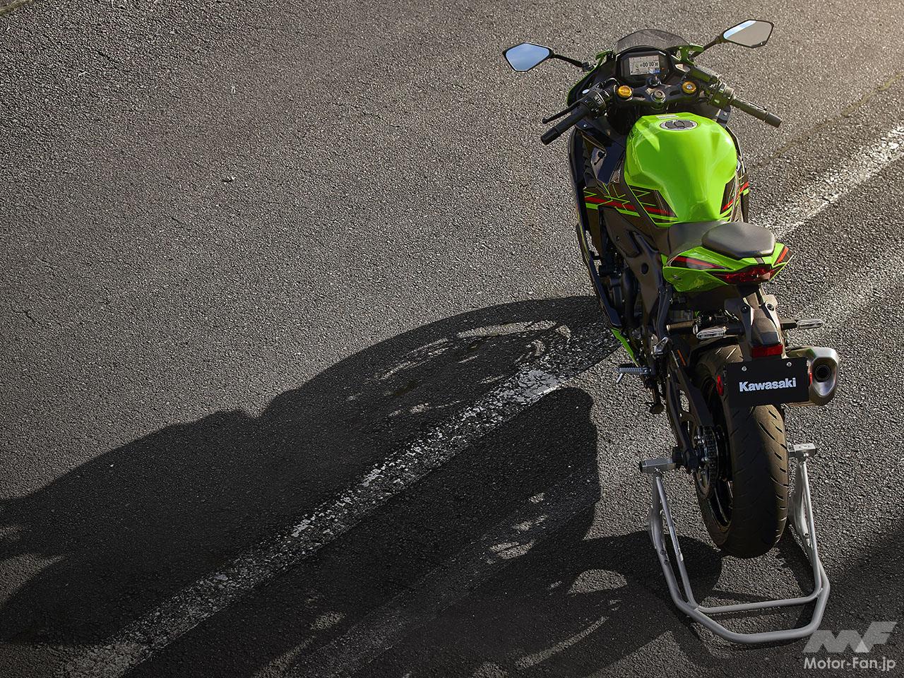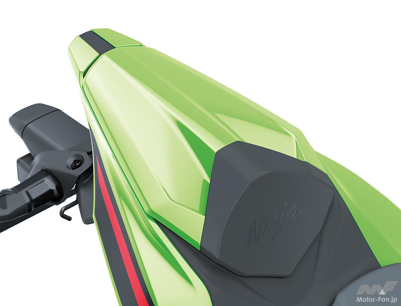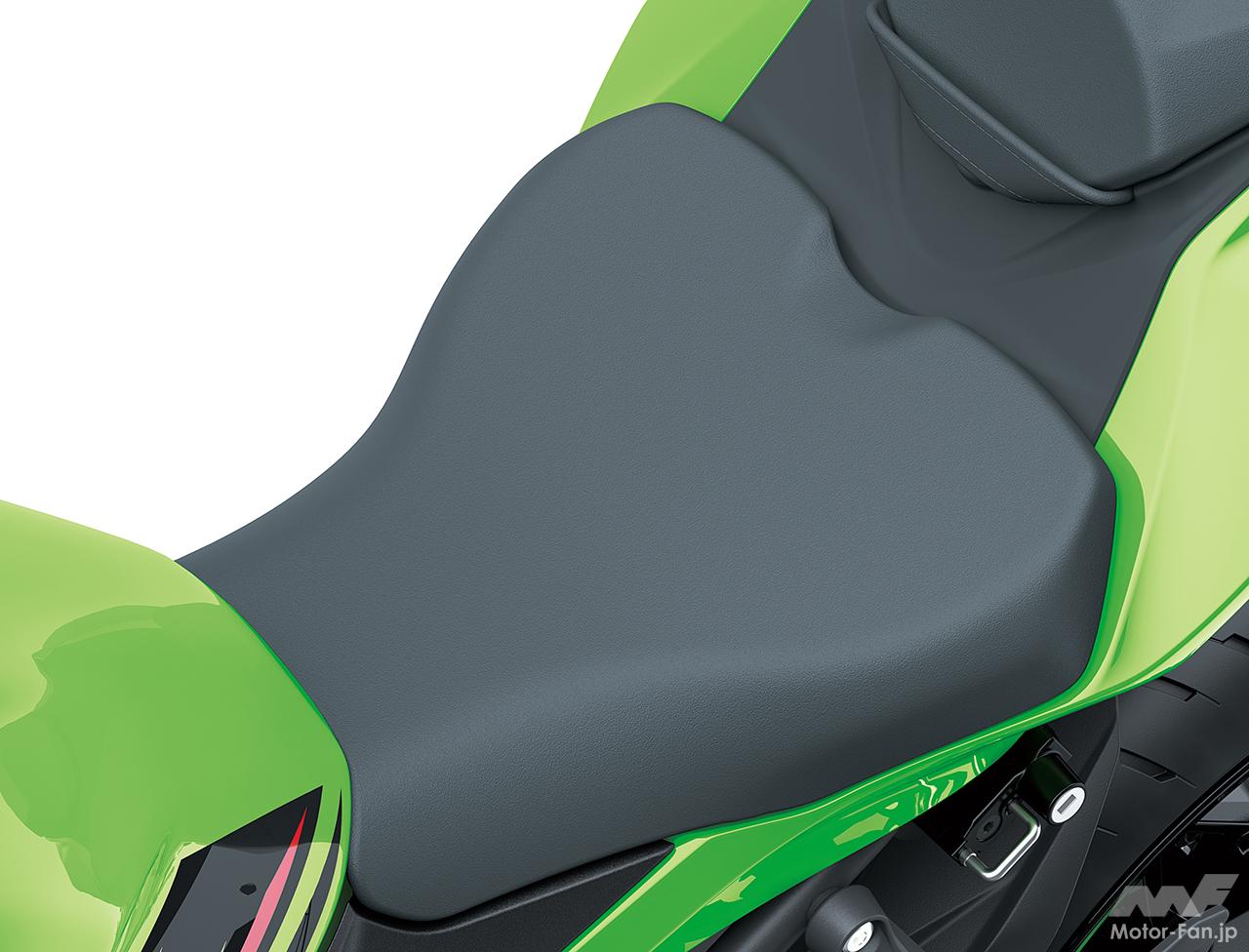 ・ライディングポジションはNinja 400よりもアグレッシブながらリラックス感もあり、ライダーは過度な前傾姿勢を取ることなく、俊敏なスーパースポーツハンドリングを堪能することができる。空気抵抗の低減と防風効果をバランスさせたライディングポジションは、ライダーの自由度も高めている。