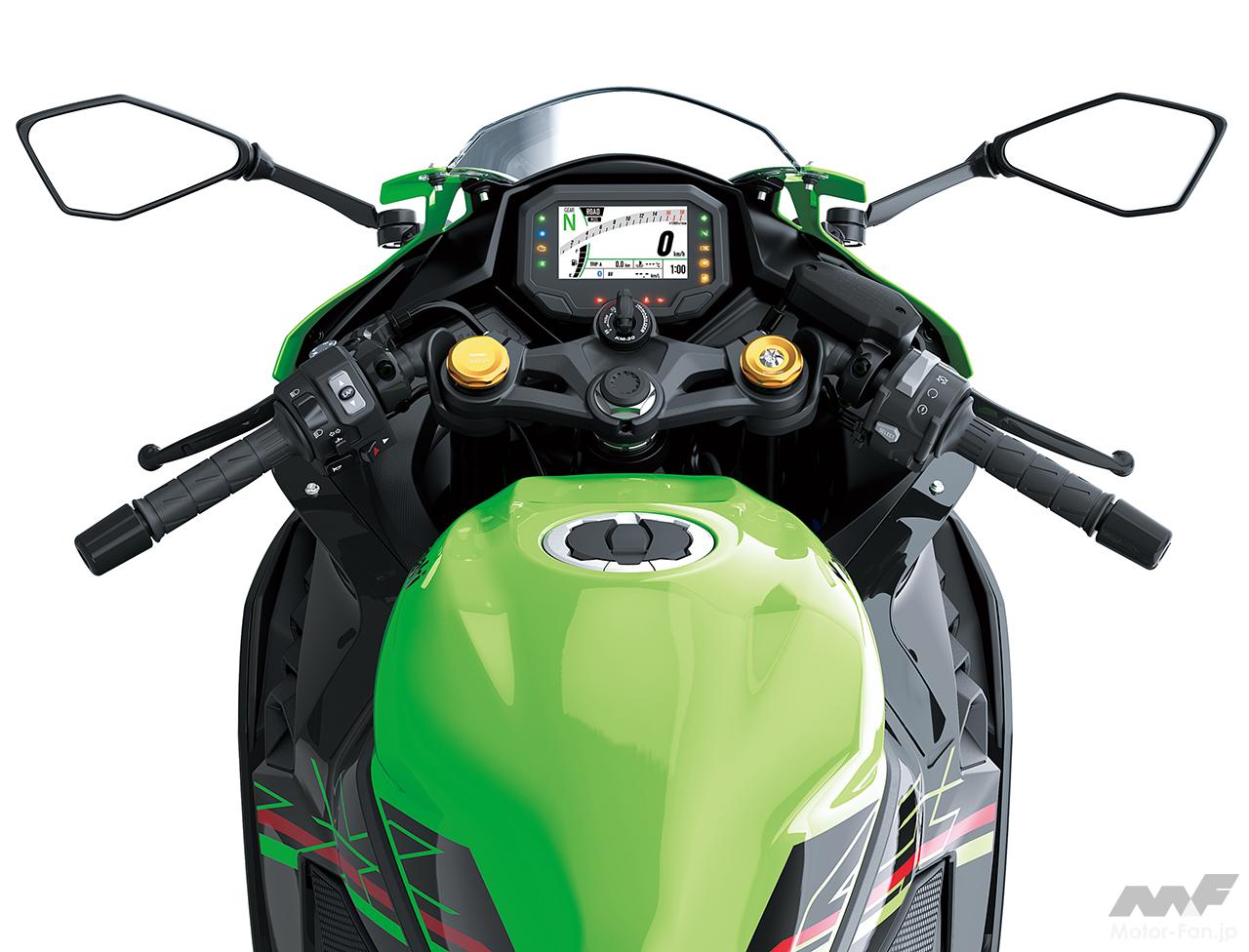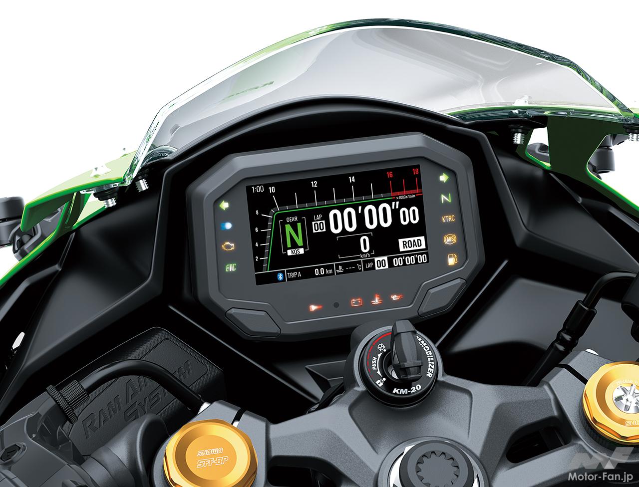 ●ディスプレイ機能:デジタルスピードメーター、デジタルバースタイルタコメーター、ギヤポジションインジケーター、シフトアップインジケーター、燃料計、オドメーター、デュアルトリップメーター、瞬間/平均燃費、航続可能距離、平均速度、アワーメーター、水温、時計、電圧計、ストップウォッチ、カワサキサービスリマインダー、オイル交換リマインダー、インテグレーテッドライディングモードインジケーター、KTRC、パワーモード、、Bluetoothインジケーター、スマートフォン電話着信/メール着信、およびエコノミカルライディングインジケーター、KQSインジケーター、イモビライザー、ETCインジケータ―
