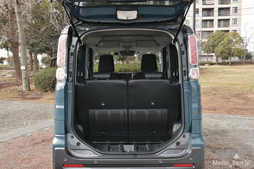 スーパーハイト系軽自動車ゆえに、室内空間は広大そのもの。身長172cmの筆者のドラポジ基準で150mmスライドする後席に座れば、頭上に28cm、膝まわりに最大約34cmものスペースがある。ハスラーが同約13cm、最大27cmだから、その差は歴然。車中泊にも対応する。