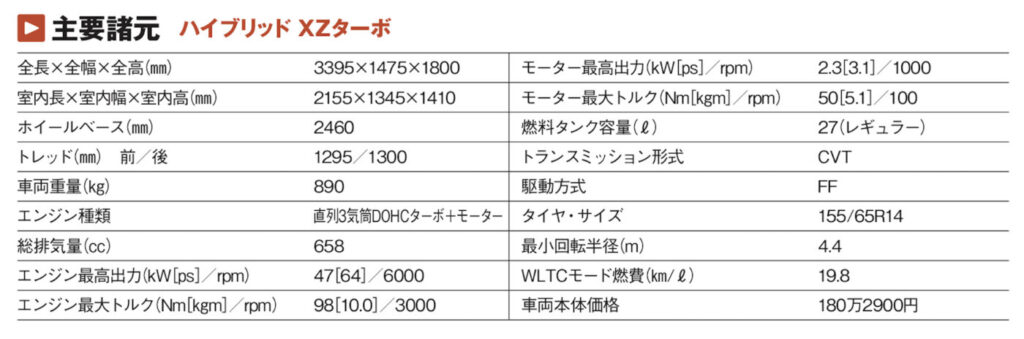 月間登録台数 7452台 スペーシア、スペーシアカスタムを含む (21年8月〜22年1月平均値) 現行型発表 18年12月(一部改良 21年12月) WLTCモード燃費 21.2km/l ※「ハイブリッド XZ」のFF車