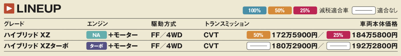 ワゴンRと並び、今ではスズキのドル箱モデルとなっているのがスーパーハイト系軽自動車であり、全車マイルドハイブリッドとなったスペーシア。標準車とエアロ系のカスタムのほか、今ではアウトドアに似合うクロスオーバーSUVテイストのスペーシアギアが加わっている。ハスラー同様、思わず海へ、山へ出掛けたくなるよりアクティブでマルチパーパスな〝ギア〞というわけだ。