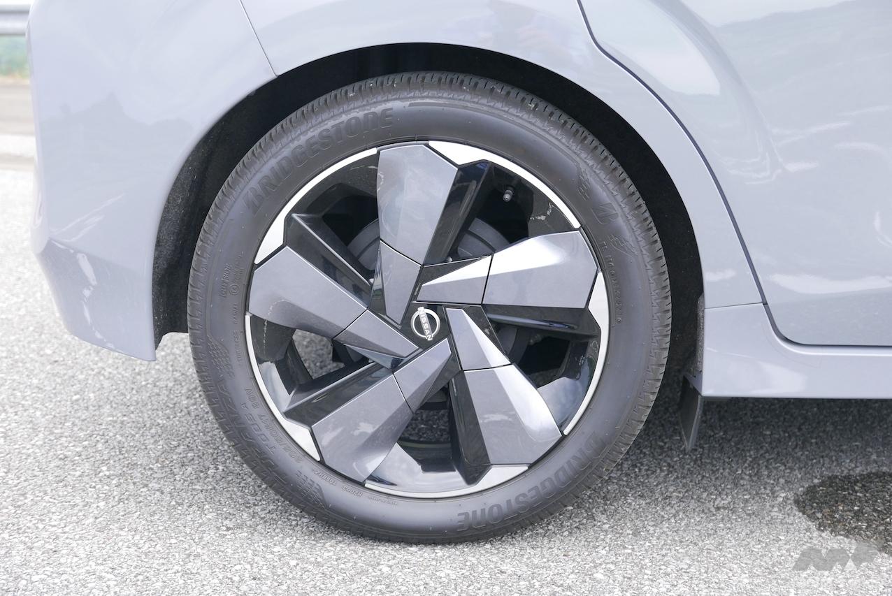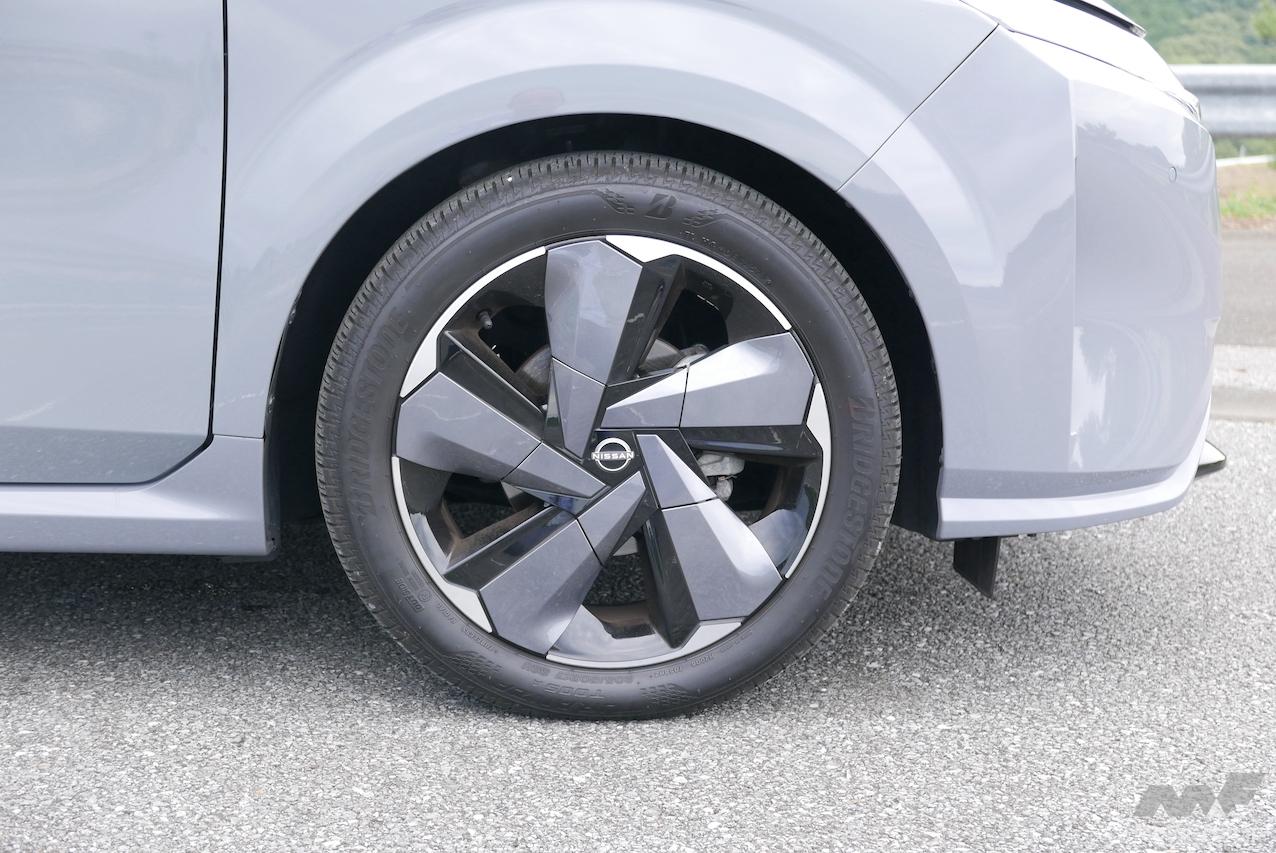 パワーユニットは発電用の1.2ℓ直3ミラーサイクル・ガソリンエンジンに変更はないが、フロントモーターはノートの116ps/280Nmから136ps/300Nmへとパワーアップされている。リヤモーターは68ps/100Nmで同スペック。タイヤはノートの185/60R16に対し205/50R17を履いている。
