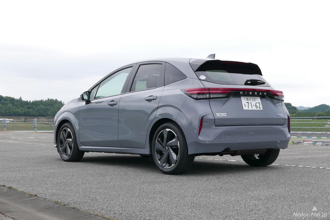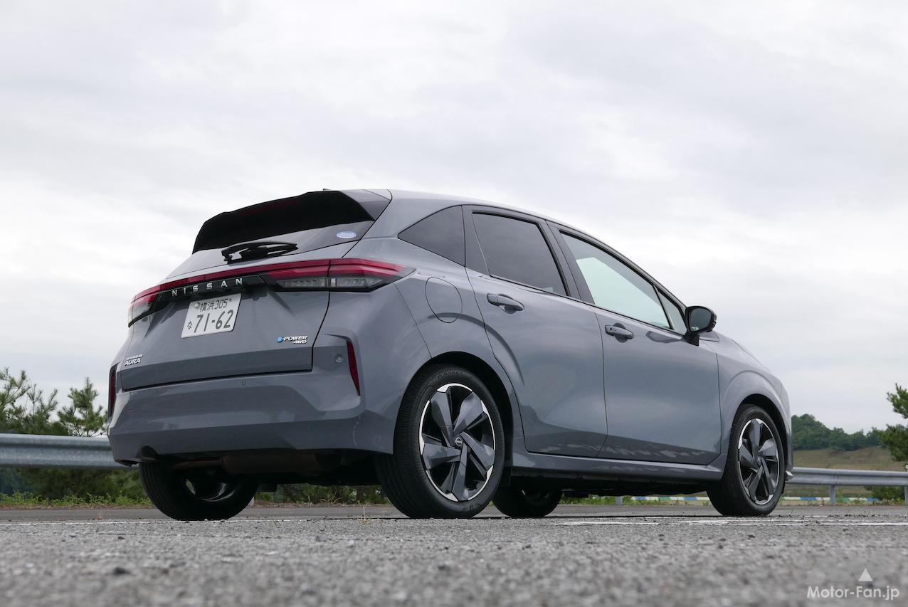 エンジン始動のタイミングも外乱の音や加速音の上昇時に合せるかのように、静かにスタートしジワジワと回転を上げていくから、耳障りになることも少ない。速度とエンジン回転上昇の協調性に関しては、先代ノートと比較して格段に進化しているうえに、オーラ自体の遮音性の高さによって、静粛性はBEVに確実に近づいている。