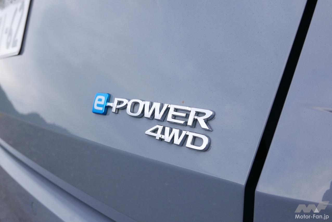 パワーユニットは発電用の1.2ℓ直3ミラーサイクル・ガソリンエンジンに変更はないが、フロントモーターはノートの116ps/280Nmから136ps/300Nmへとパワーアップされている。リヤモーターは68ps/100Nmで同スペック。タイヤはノートの185/60R16に対し205/50R17を履いている。