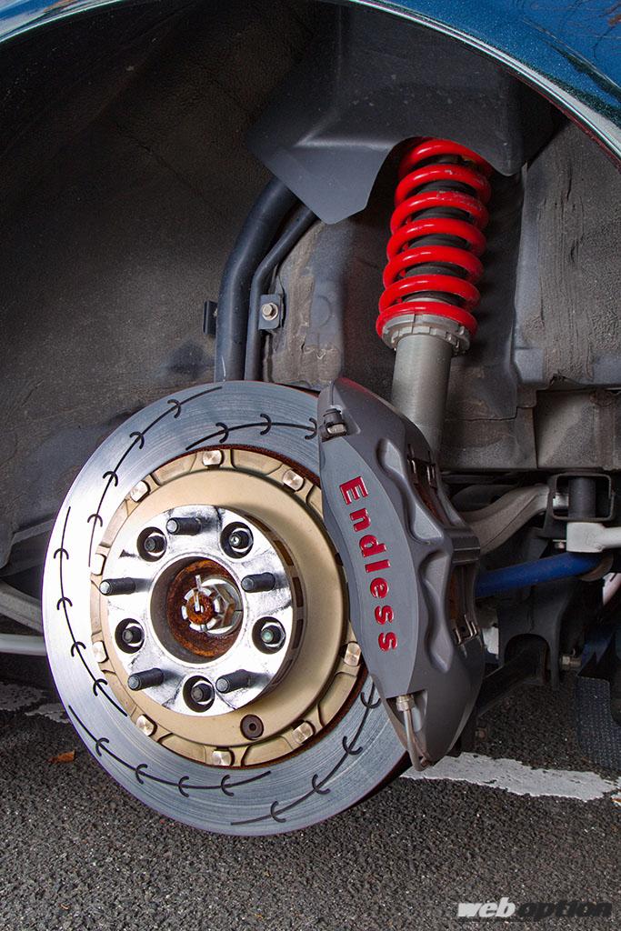 ブレーキは超ハイエンドなシステムで強化している。キャリパーにはエンドレスのモノブロックを奢り、ローターも同社のeスリットで径はフロント370mm、リヤ332mmという構成だ。