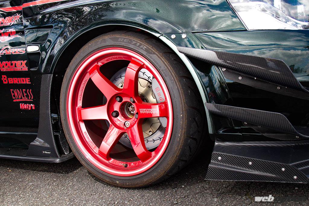 ホイールは18インチのボルクレーシングTE37RTでサイズは11J+17の通し。組み合わされるタイヤは295/30R18サイズのポテンザRE-71Rだ。