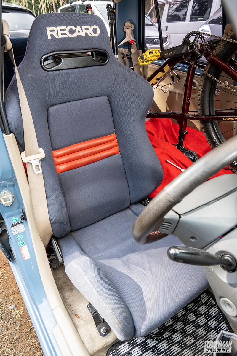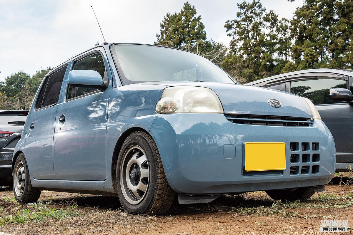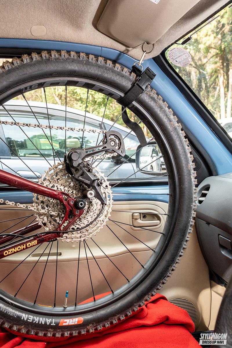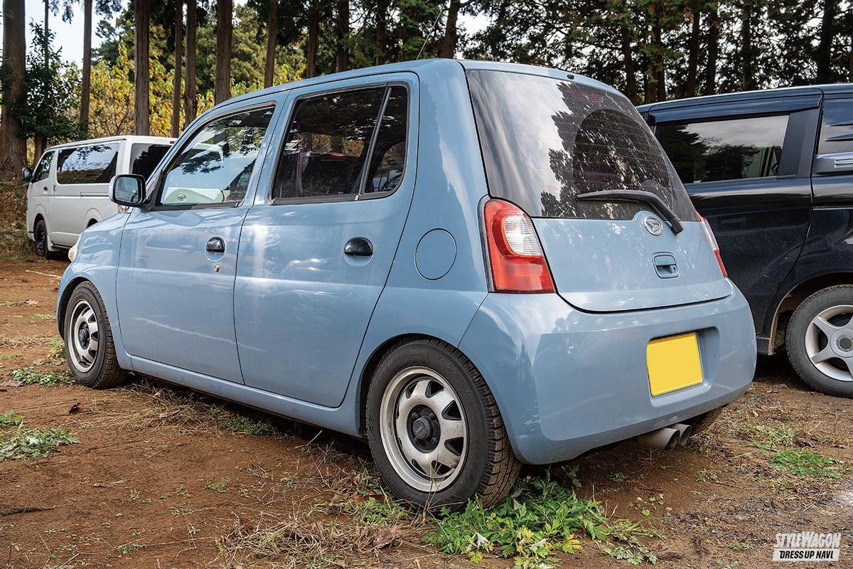 Kカー、しかも背の低いエッセで、どう自転車を積むのか? 最初に取材陣が感じた疑問だ。助手席が倒れているから車内だろう。しかし……。オーナーを直撃すると「知恵の輪みたいです。結構考えました」とのこと。前輪を外してさかさまに、後ろのドアから挿入(?)。上手に向き・角度を調整しながら……。その光景はさながら匠の技。クルマの方も個性的で、懐かしのカップホイールに、ムーヴのミッションに載せ換え、センター出しマフラーと個性的だったゾ!