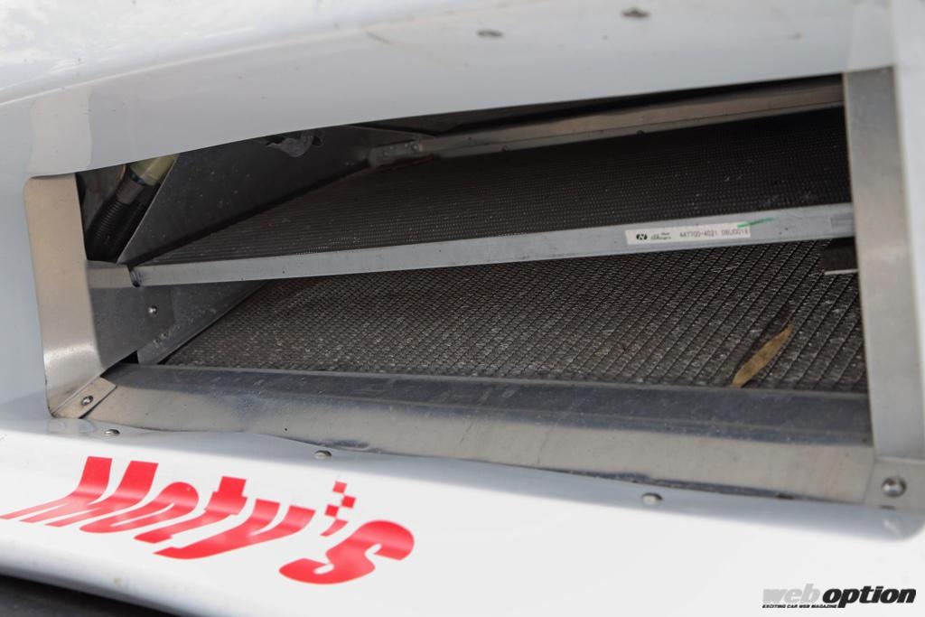 クーリングチューンも万全だ。ロータリーエンジンは吸気温がシビアなので、ブリッツ製3層インタークーラーとDRL製アルミ3層ラジエターをVマウントで配置。オイルクーラーも余裕を持たせる意味で、HPI製19段に変更している。