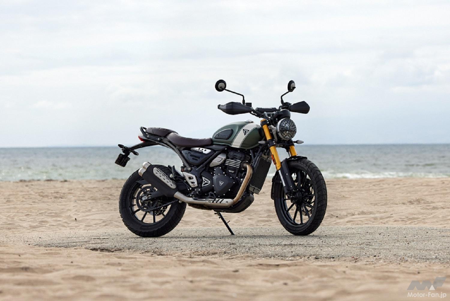 Scrambler 400 Xには、スタイリッシュでモダンな3種類のカラー設定があり、それぞれにトライアンフの特徴である「スクランブラー」タンクストライプとトライアングルバッジがあしらわれている。カラーは、マットカーキグリーンとフュージョンホワイト、カーニバルレッドとファントムブラック、さらにファントムブラックとシルバーアイスも選択可能。