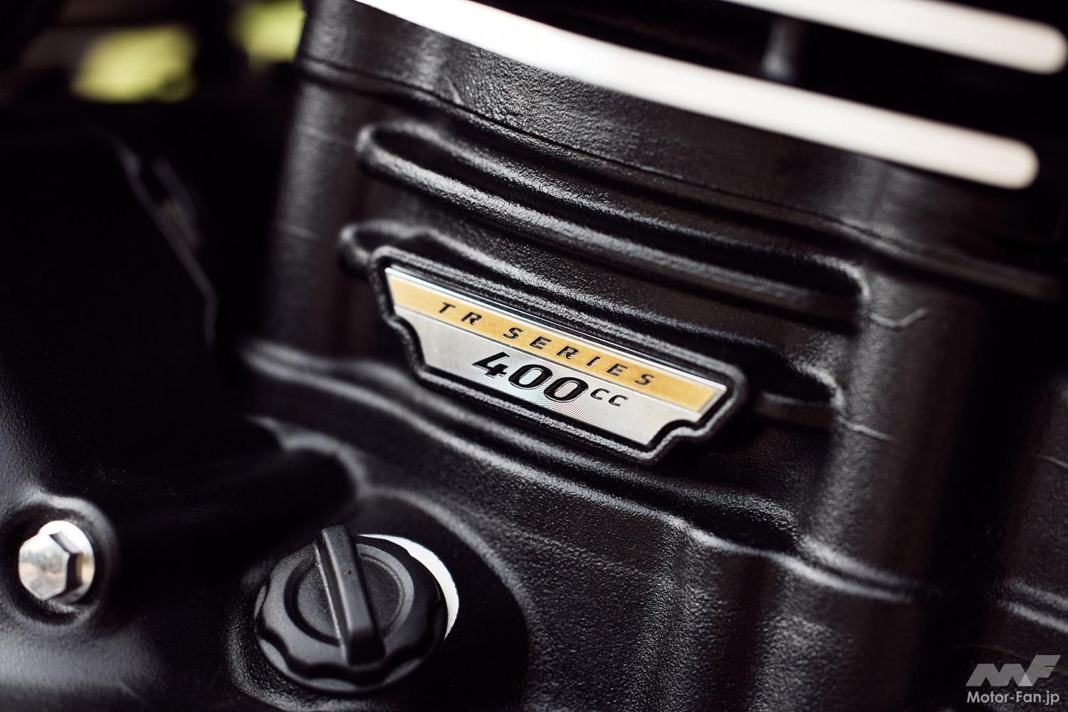 トライアンフのトレードマークであるモダンクラシックなスタイルと、最先端のエンジニアリングが融合した、最新のフューエルインジェクション・水冷398cc単気筒エンジンが、クラス最高レベルのパフォーマンスを発揮、レスポンスがよく快適なパワー特性と、躍動感のある豊かで個性的なエグゾーストサウンドを実現。
